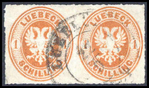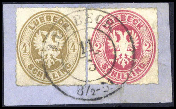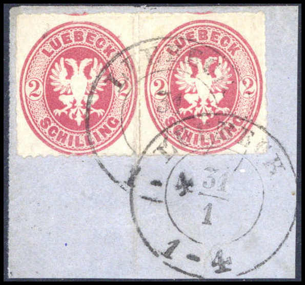 2 Sch., waagr. Kabinettpaar auf Briefstück mit klarem K2 LUEBECK, sign. Engel BPP