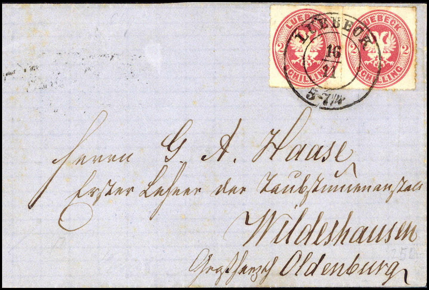 2 Sch., waagr. Paar mit ideal klarem K2 LUEBECK (am Rand etwas gummifleckig) auf fast kpl. blauem Brief nach Oldenburg