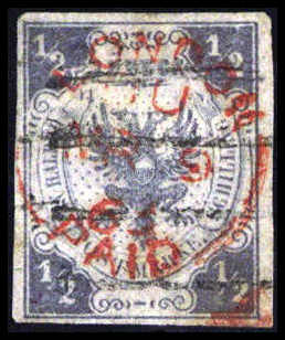 ½ Sch., ringsum breitrandiges Exemplar mit sauber aufges. Strichstempel (re. winz. Randspalt), zusätzl. entwertet mit genau zentrisch aufges. roten Stempel LONDON PAID MR 9 63. Ein außergewöhnliches Stück, sign. Krause, Engel, Grobe. Katalogpreis: 2.000,-+