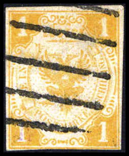 1 Sch., helle Nuance, schönes, unten noch voll- sonst breitrandiges Exemplar mit gestochen klarem schwarzem Strichstempel (rs. zwei kl. Ausbesserungen), mehfach sign. und Fotoattest Brettl ("eine gebraucht seltene Marke"). Katalogpreis: 2.000,-