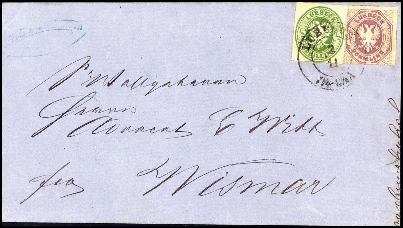 ½ Sch., Mischfrankatur mit Ausgabe 1865, 1½ Sch. braunpurpur, Luxusstücke mit sauber aufges. K2 LUEBECK auf schönem blauen Brief nach Wismar, sign. Ebel, Friedel, Fotobefund Brettl BPP