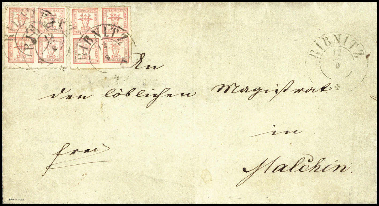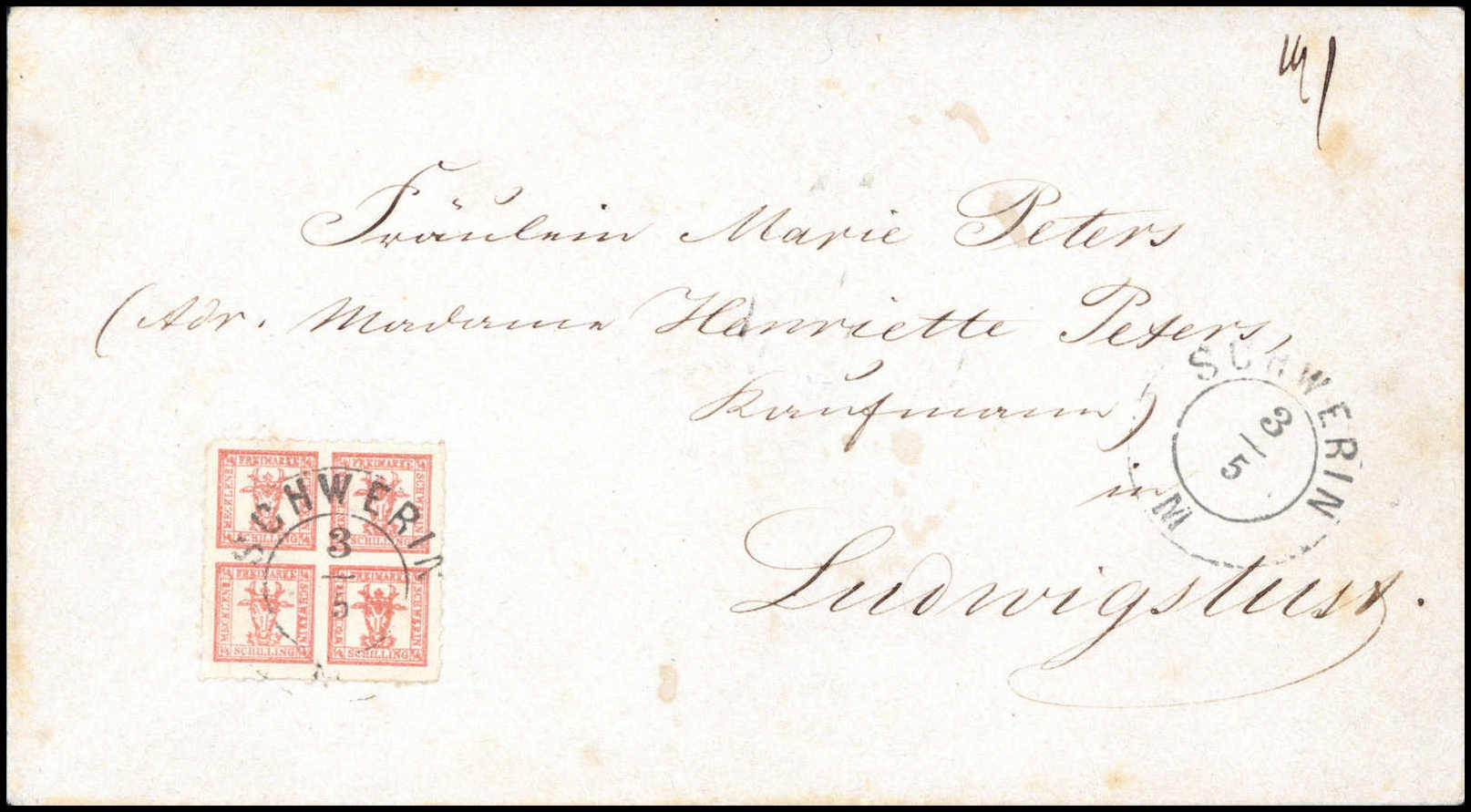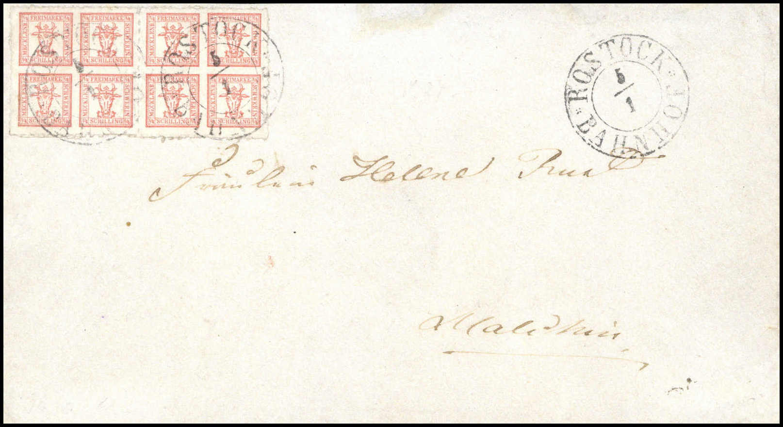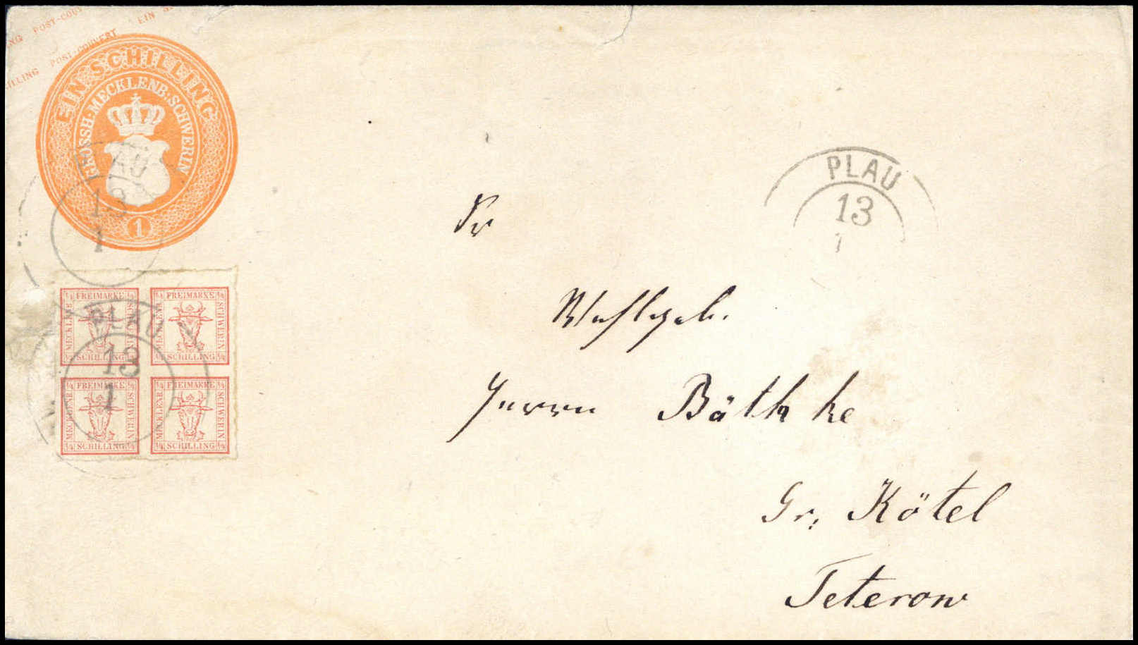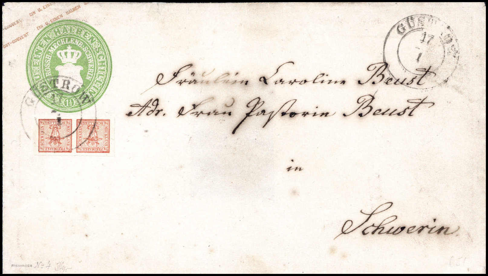 getrennt. Als Zusatzfrankatur auf diesem Ganzsachenumschlag eine Mecklenburg-Rarität, Fotoattest Berger BPP ("Ein seltener und optisch schöner Brief"). Katalogpreis: 4.000,-