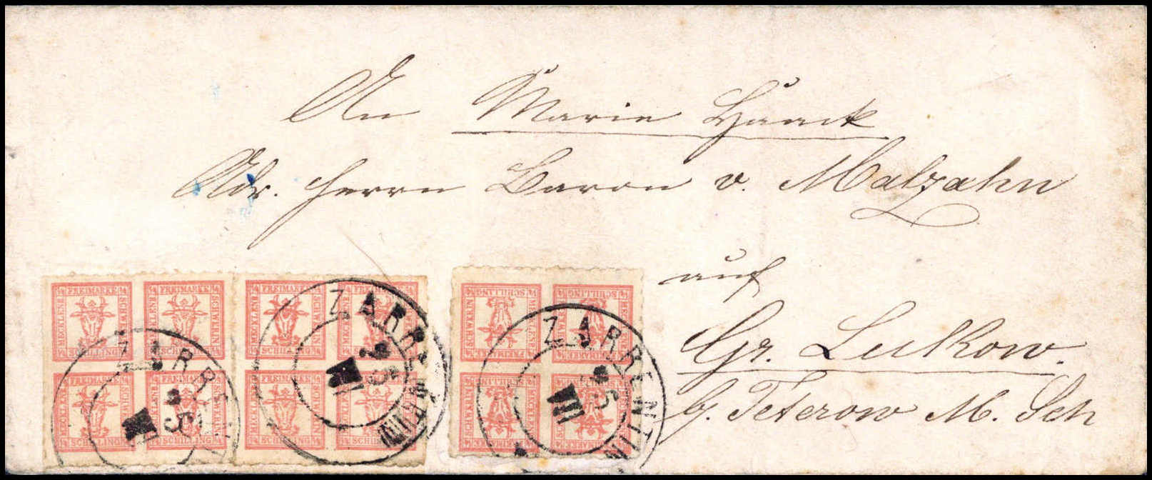 4/4 Sch., drei frische Kabinettstücke auf kleinem Damenkuvert nach Gr. Lukow, zentr. K2 ZARRENTIN. Selten