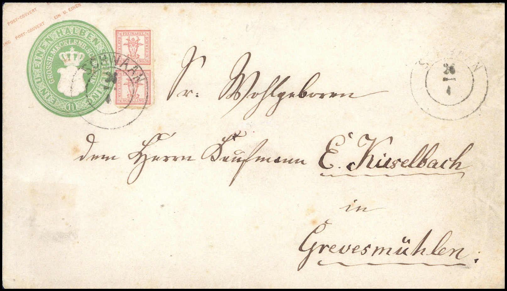 2/4 Sch. rot auf Ganzsachenumschlag 1½ Sch. grün mit sauber aufges. K2 ROSTOCK nach Sternberg, rs. Bahnpost-Transitstempel. In ausgezeichnet frischer und sauberer Erhaltung, die 2/4 Sch. wie meist teilweise mit der Schere aus dem Bogen