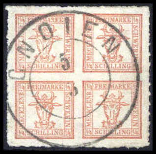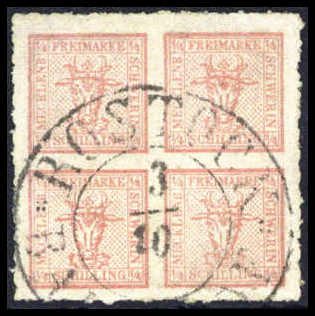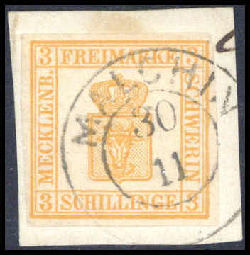 4/4 Sch., besonders farbfrisches Exemplar mit exakt gerade und klar aufges. K2 ROSTOCK BAHNHOF, rs. winz. ausgebessert. außergewöhnlich schönes Exemplar dieser seltenen Marke, sign. Bühler. Katalogpreis: 2.500,-