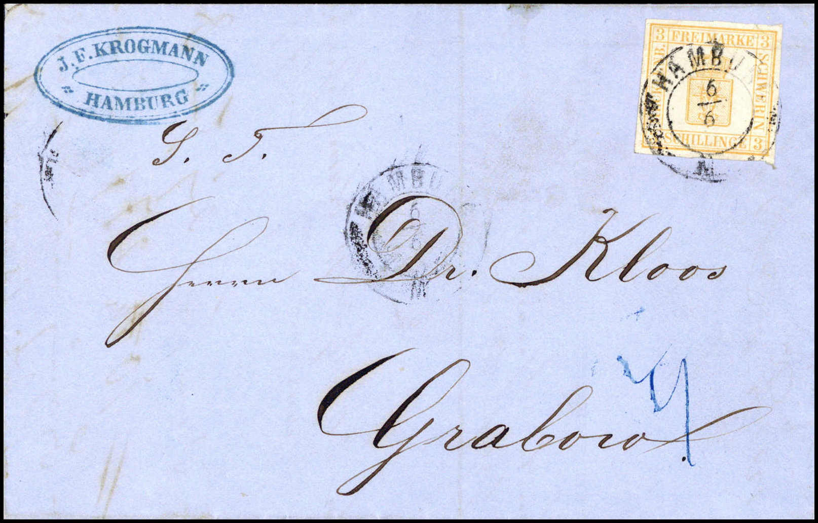 3 Sch., blauer Luxusbrief mit K2 HAMBURG nach Grabow