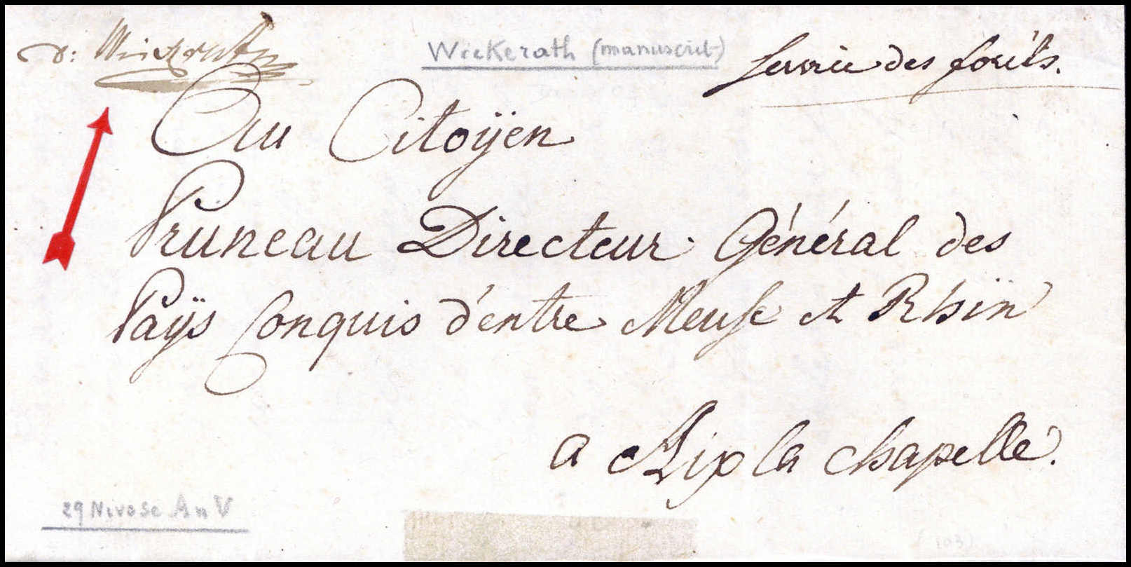 1798, "D: Wickrath", hs. Aufgabevermerk auf Brief nach Aachen (unten Klebestelle)