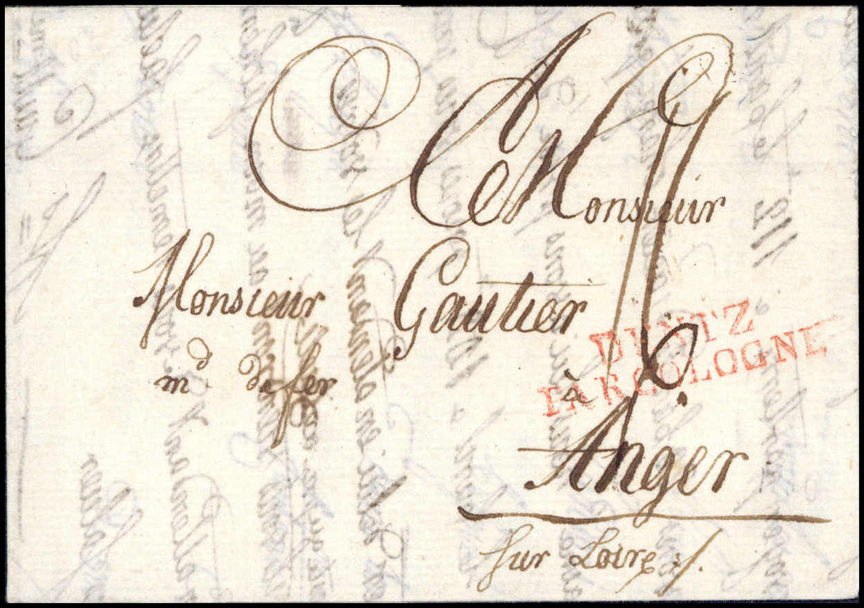1802, DENTZ PAR COLOGNE, roter L2 klar auf Kabinettbrief von Remscheid