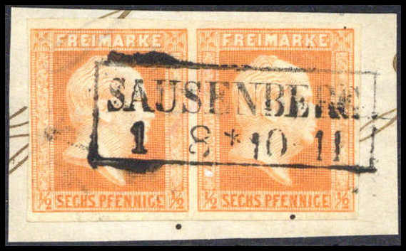 Der waagerechte Sechserblock ½ Sgr. orange: ½ Sgr., ringsum voll- bis breitrandig geschnittener, waagr. Sechserblock in leuchtend frischer Farbe und mit vollständigem Originalgummi (im Zwischenraum waagr. vorgefaltet, die Marken nicht