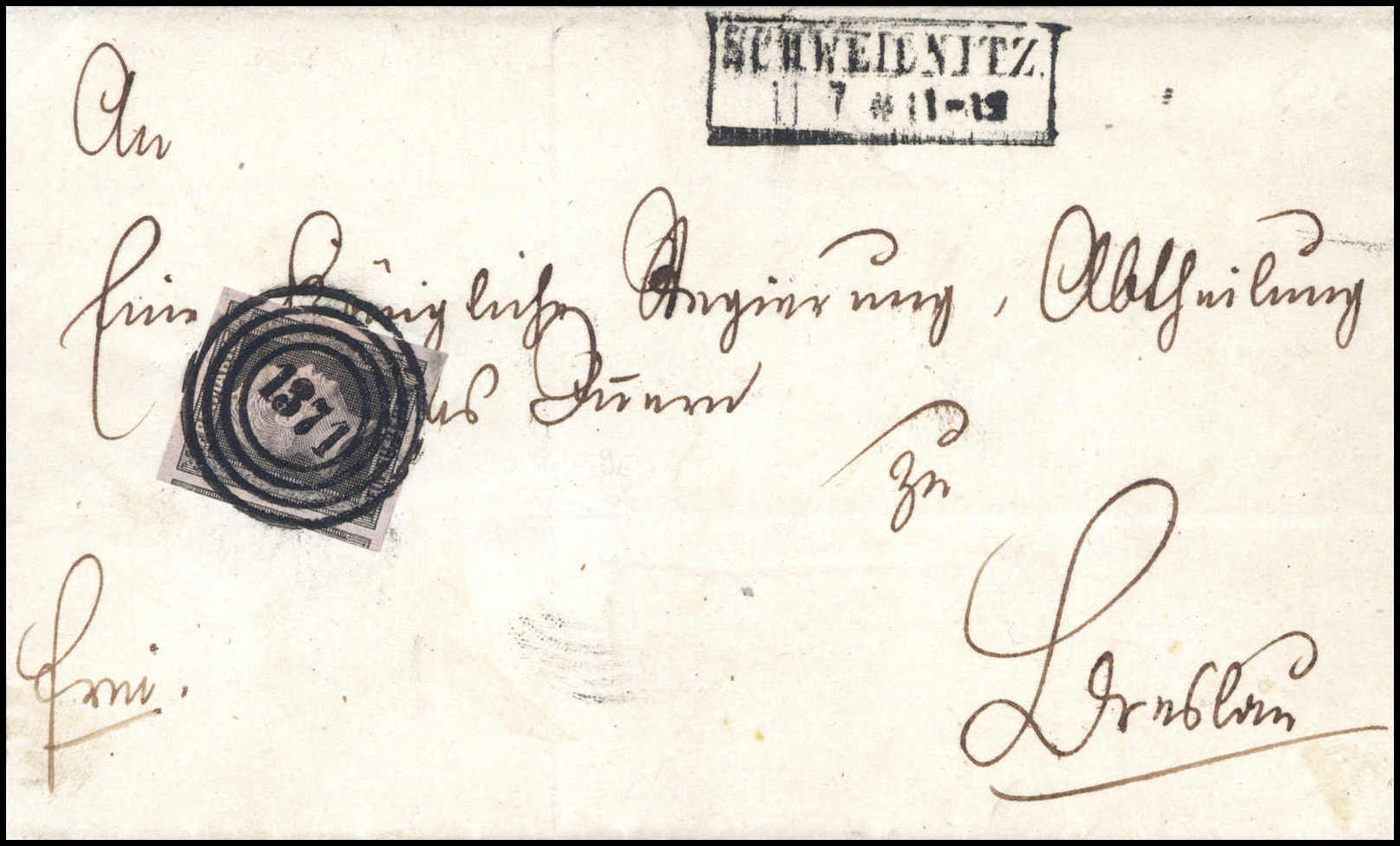 1 Sgr. lilarosa, extrem breitrandiges Luxusstück mit zentr. klarem Stempel "1371" SCHWEIDNITZ auf gef. Brief, sign. Kastaun BPP