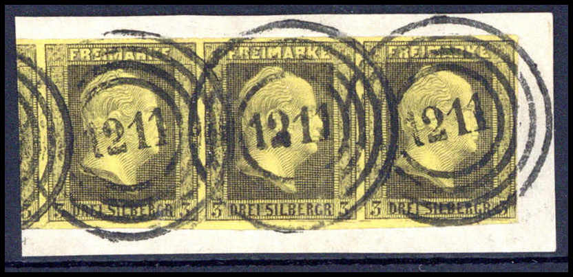 3 Sgr., waagr. Luxus-Dreierstreifen auf Bfstk. mit idealen Stempeln "1211" REETZ. Katalogpreis: 150,-+