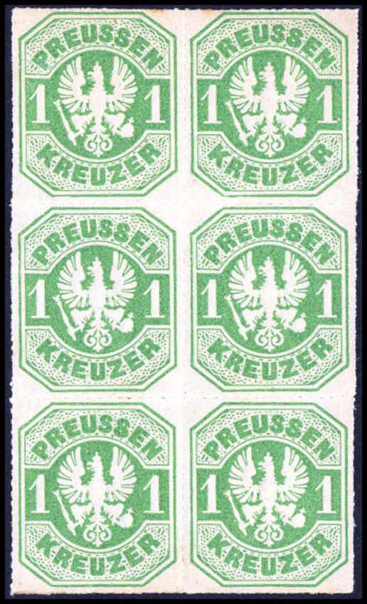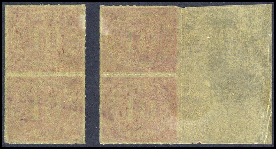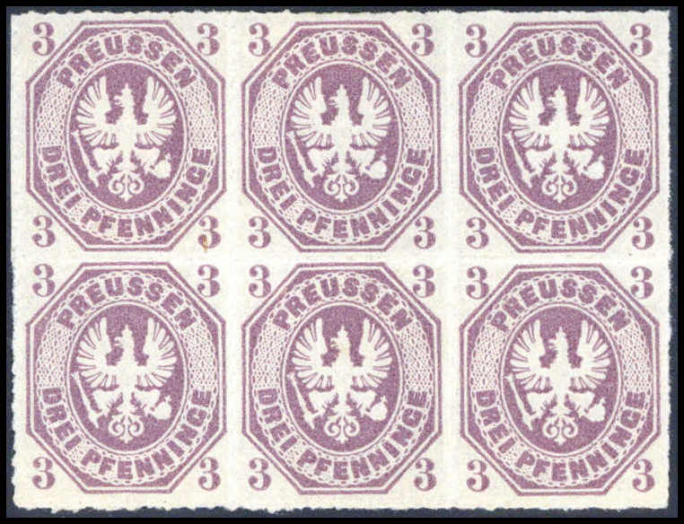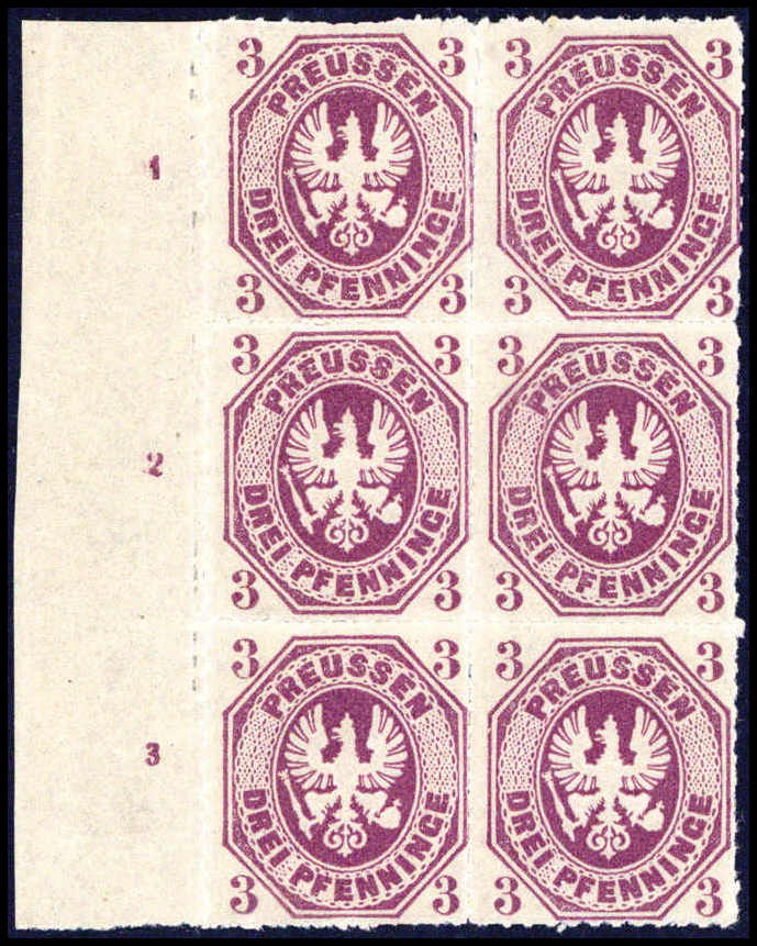 3 Pfg. dunkelpurpur, ungebr. senkr. Sechserblock mit li. Bogenrand und Reihenzahlen "1" bis "3", oben ganz leicht angetrennt, sonst in tadelloser Erhaltung. Zwei Marken sind absolut postfrisch. Eine extrem seltene Einheit in der b-Farbe,
