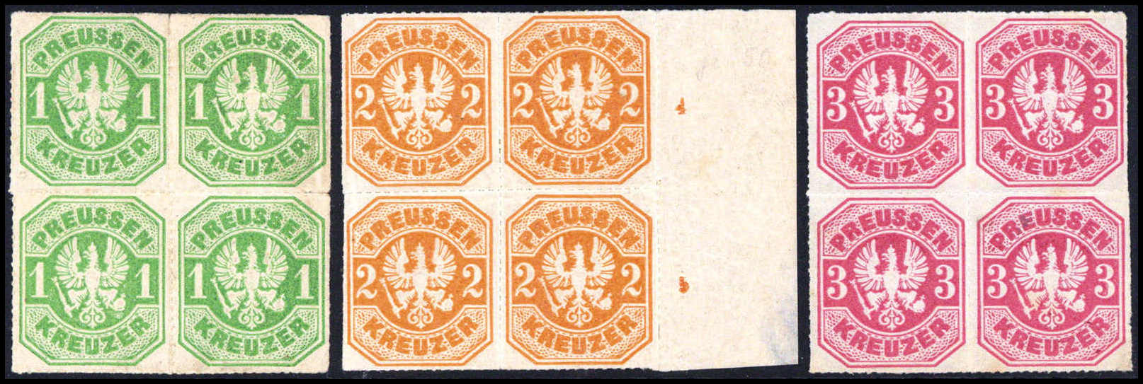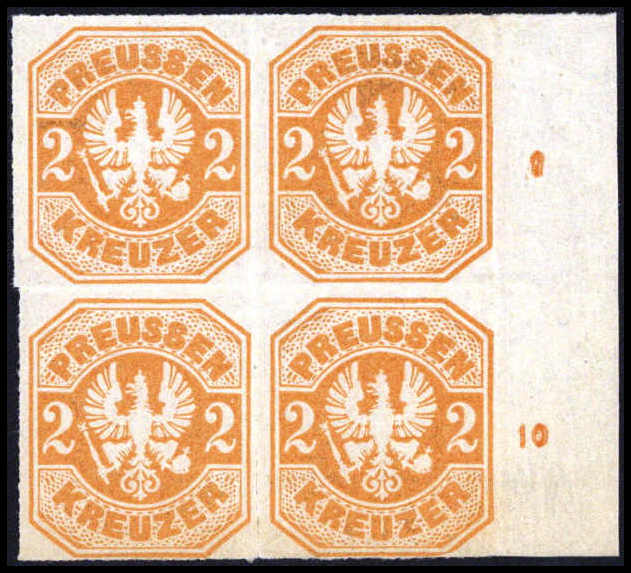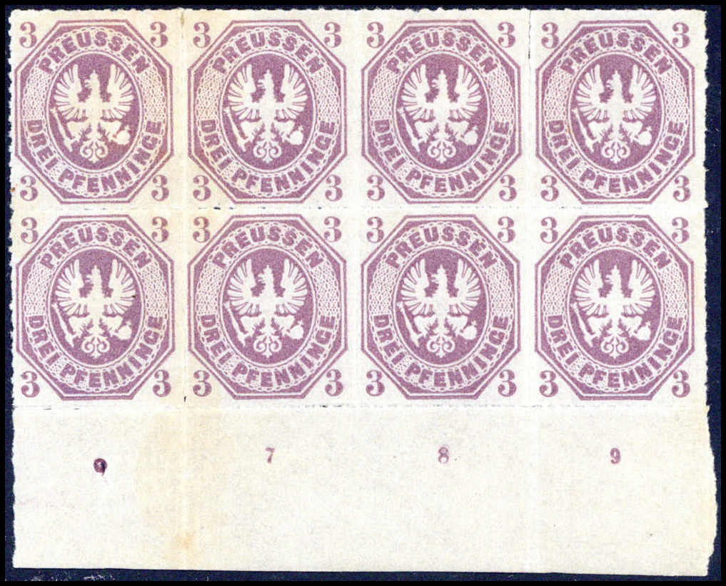 3 Pfg., ungebr. waagr. Achterblock mit unterem Bogenrand (Anlagepunkt sowie Reihenzahlen "7" bis "9". Eine seltene Einheit