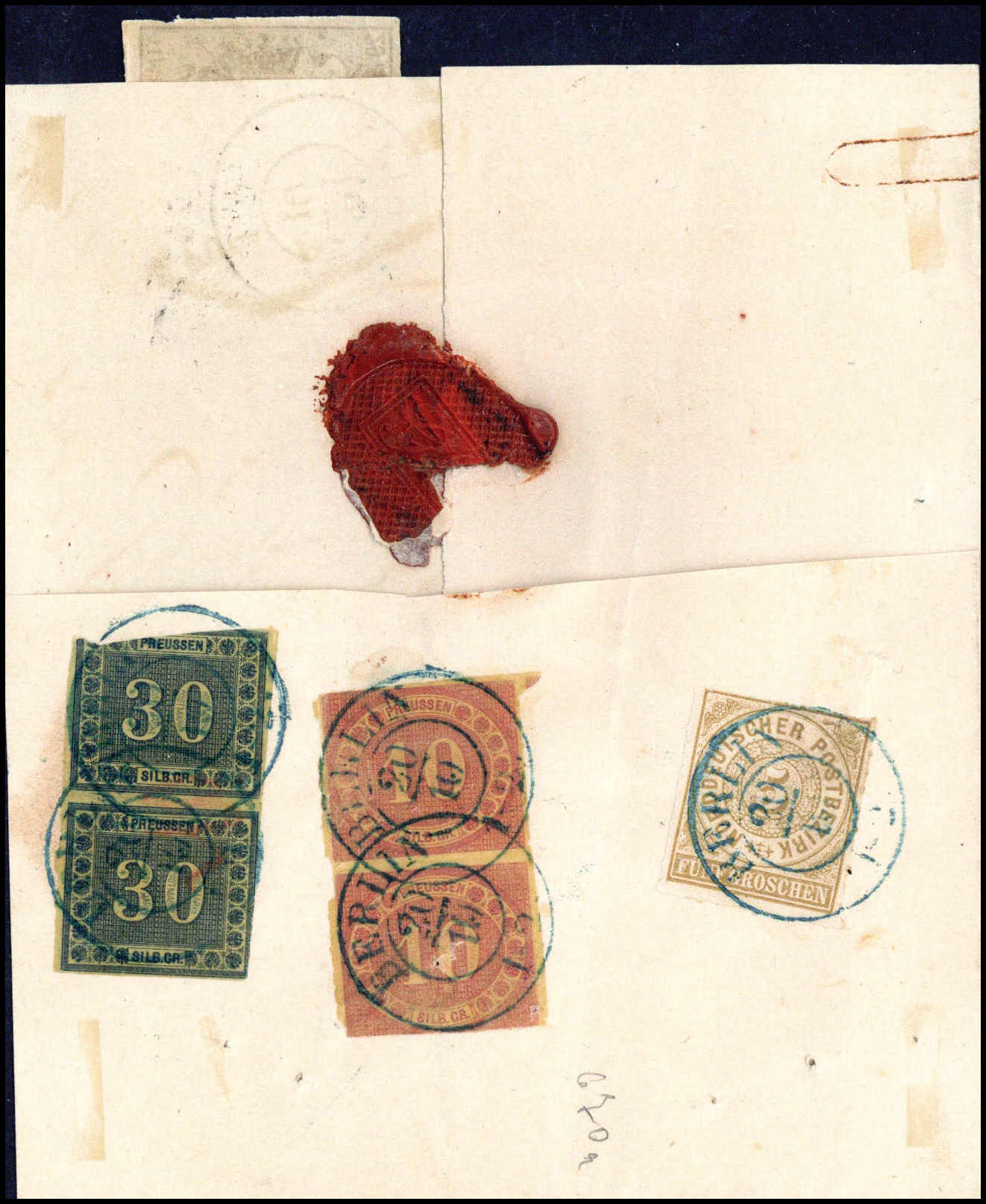 10 und 30 Sgr., je im senkr. Paar in Mischfrankatur mit NDP 5 Gr. auf aktenfrischem Paketbegleitbrief nach Paris, blaue K2 BERLIN. Bei der Ankunft mit franz. Zeitungsmarke 20 C. lila nachfrankiert. Die beiden Innendienstmarken teils