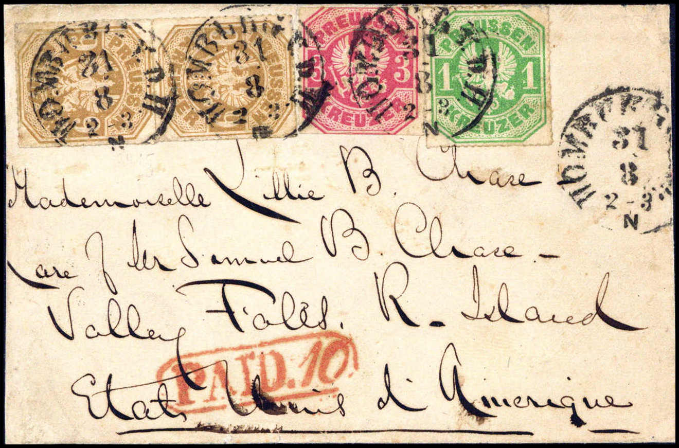 1 Kr. mit 3 Kr. rosa und senkr. Paar 9 Kr. gelblichbraun, bis auf unauffällige Scherentrennung bei der 3. Kr. alle in tadelloser Erhaltung auf besonders schönem kl. Damenkuvert in die USA, zentr. Taxis-K1 HOMBURG V.D.H. 31/8 (1867). Eine