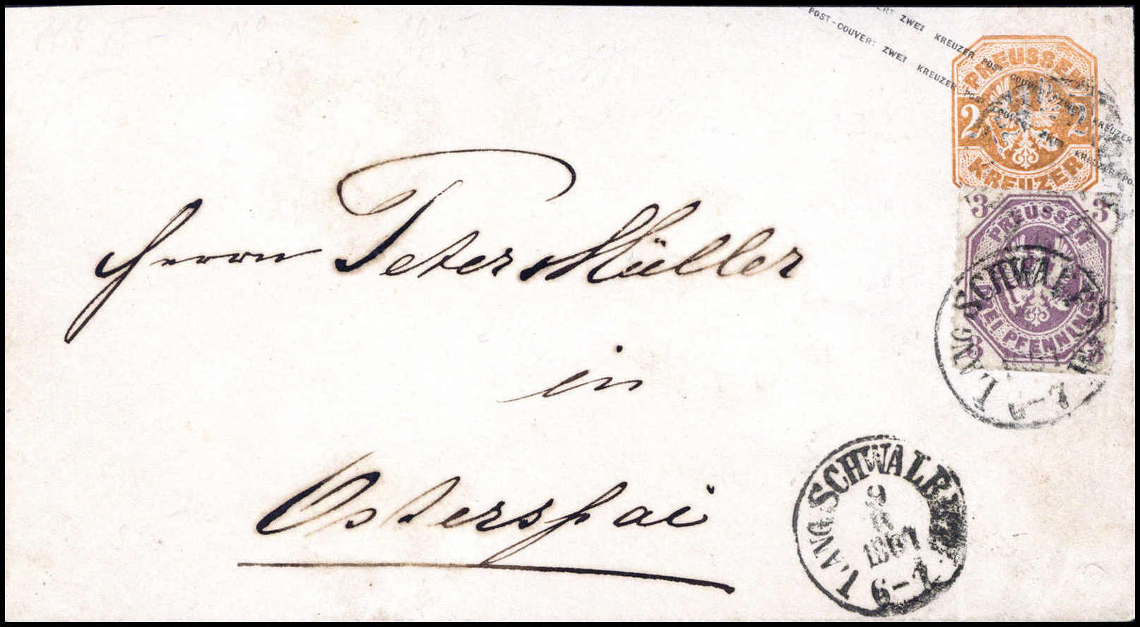 Währungs-Mischfrankatur Groschen/Kreuzer: 3 Pfg. dunkellila als Zusatzfrankatur auf Ganzsachenumschlag 2 Kr. orange mit klaren Taxis-K1 LANG. SCHWALBACH 9/8 1867 nach Osterspai. In sehr schöner und frischer Erhaltung, mit ganz leichten