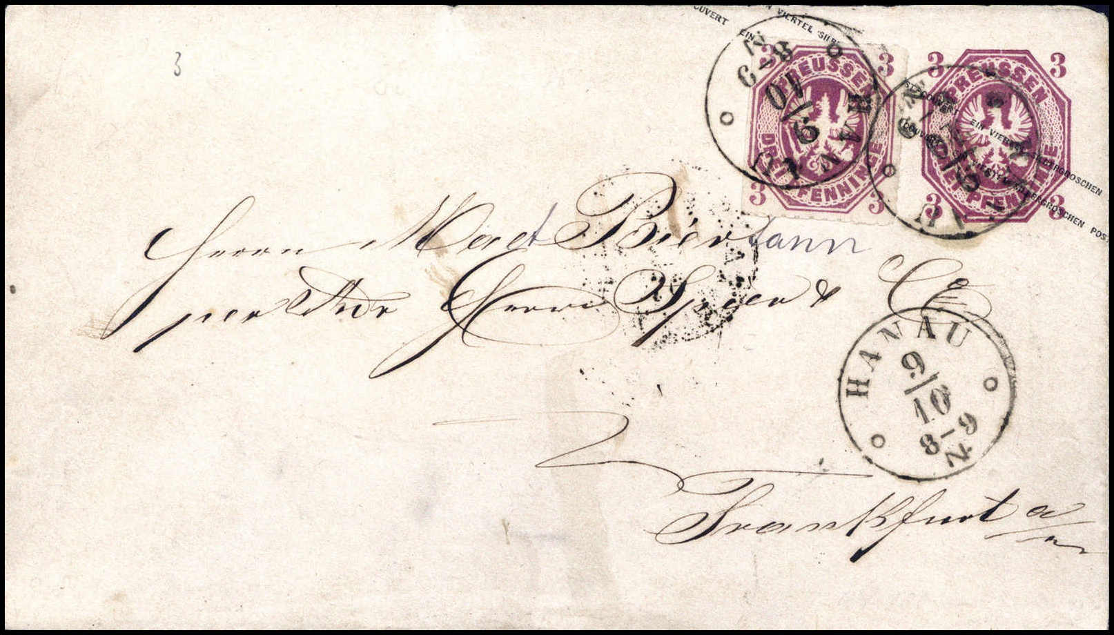 3 Pfg. rotviolett als Zusatzfrankatur auf wertstufengl. Ganzsachenumschlag 3 Pfg. mit zwei sauber aufges. Taxis-K1 HANAU 9/10 (1867). Vorzüglich frisch und sauber in der Erhaltung, die zufrankierte Marke li. mit unauffälliger