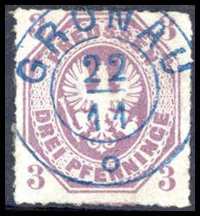 3 Pfg., Prachtstück (winz. Eckbug) mit seltener Entwertung durch blauen Hannover-K2 GRONAU. Katalogpreis: 350,-+