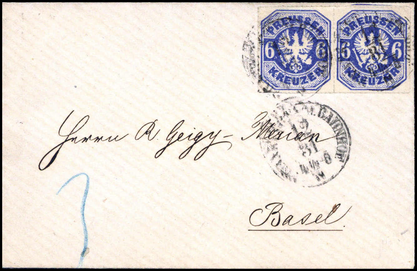 Letzttagsbrief 6 Kr., tieffarbiges waagr. Paar auf kl. Kabinettbrief nach Basel, Taxis-K1 FRANKFURT A.M. BAHNHOF 31/12 (1867). Ein seltener Letzttagsbrief ins Ausland gelaufen, Fotoattest Flemming BPP