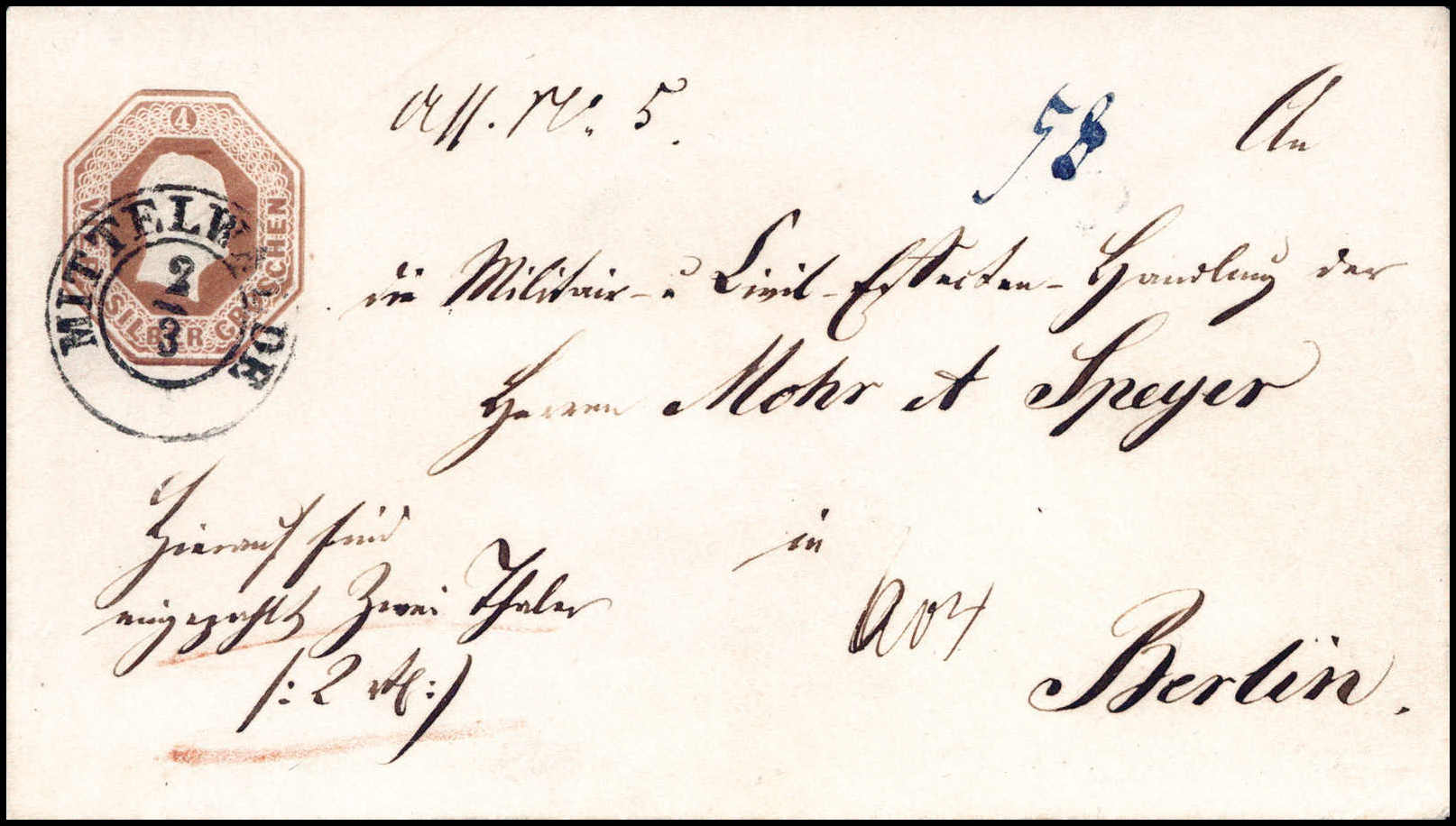 4 Sgr., WSt.-Nr.2, frischer Kabinettumschlag mit klarem K2 MITTELWALDE nach Berlin (rs. ohne das Lacksiegel). Katalogpreis: 650,-+