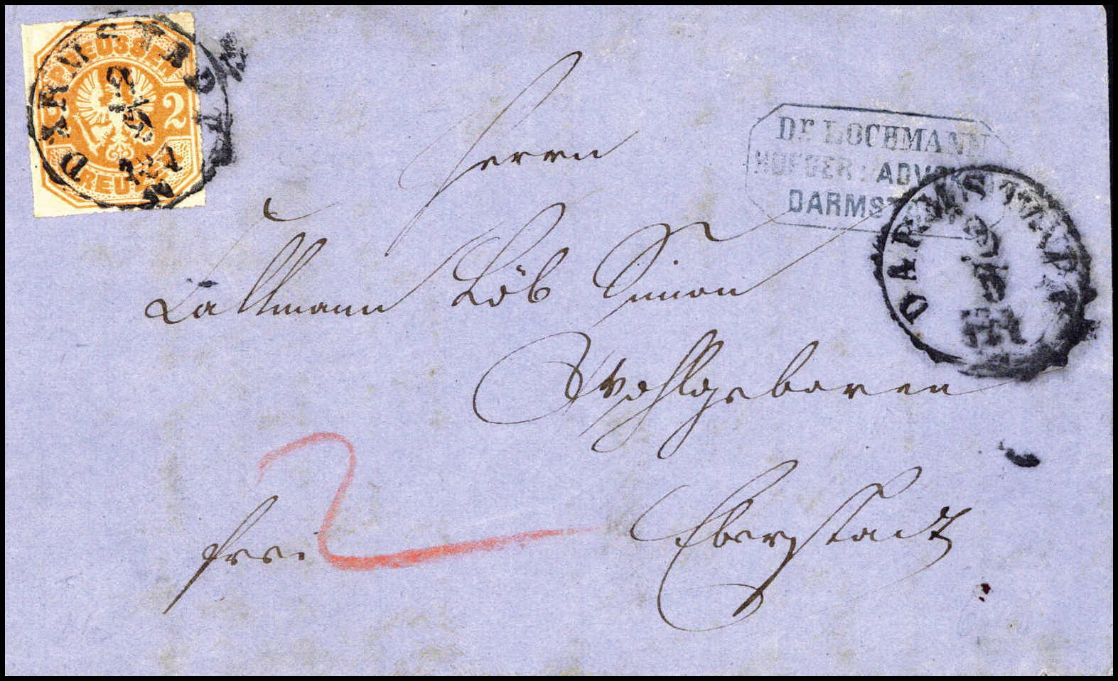2 Kr., Kabinettbrief mit klarem Taxis-K1 DARMSTADT und hs. Taxvermerk "2" nach Eberstadt. Katalogpreis: 600,-
