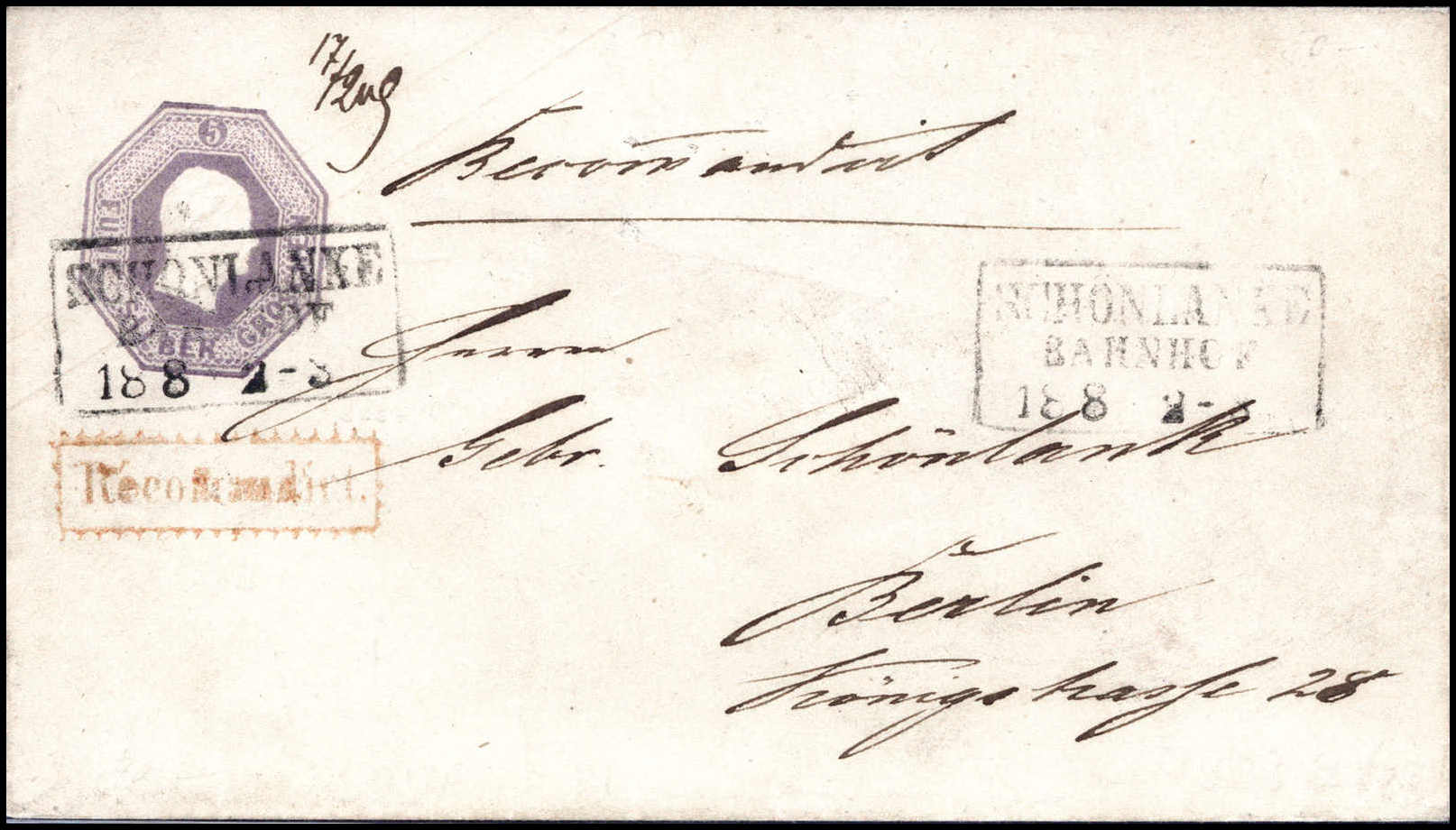 5 Sgr., Pracht-Umschlag als rekommandierter Brief mit R3 SCHÖNLANKE BAHNHOF nach Berlin, sign. Kruschel. Katalogpreis: 650,-