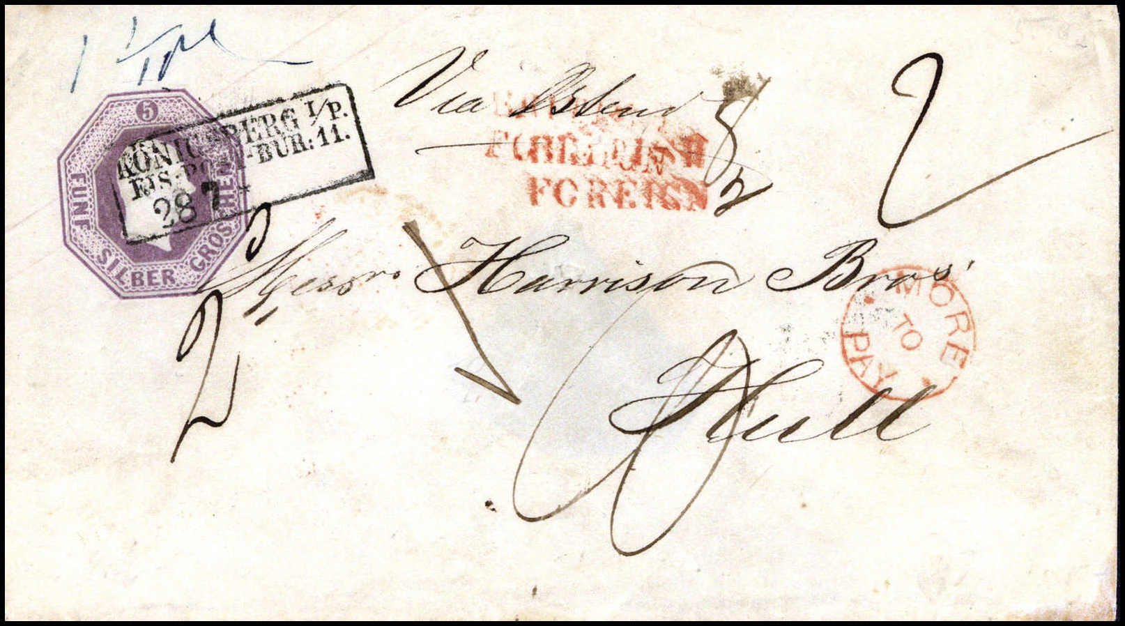 5 Sgr., Pracht-Umschlag (kl. Nadelstich) mit klarem R3 KÖNIGSBERG I/P. EIS.-POST-BUR: 11 28/7 (1861) nach England, dort nachtaxiert, Fotoattest Brettl. Katalogpreis: 650,-