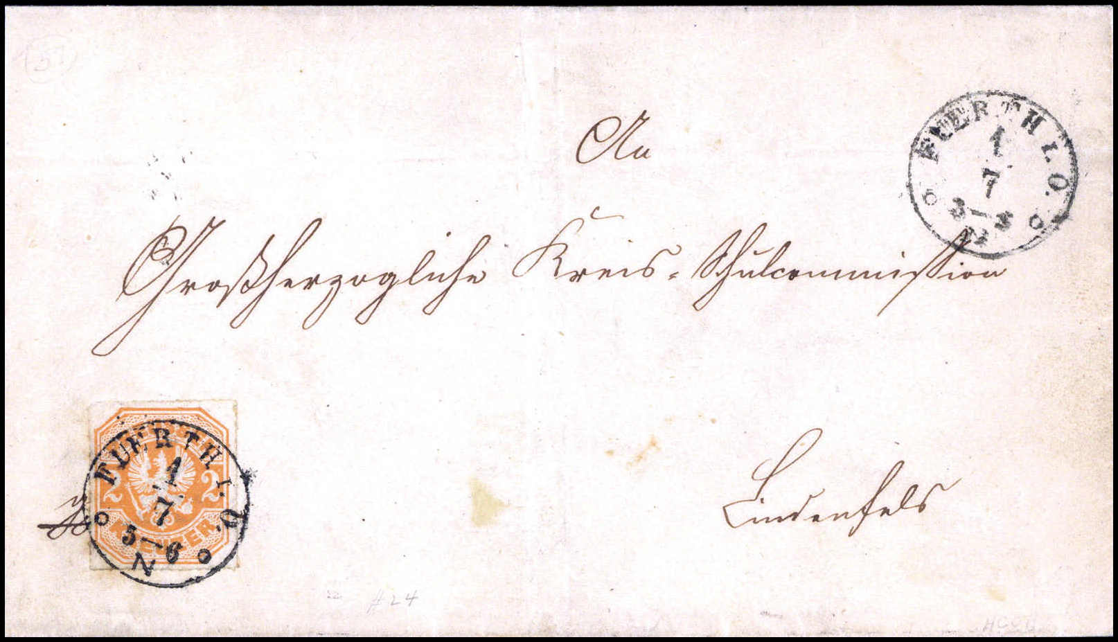 Ersttagsbrief: 2 Kr., Kabinettstück mit sauber aufges. Ersttagsstempel, Taxis- K1 FUERTH i. O. 1/7 (1867) als Einzelfrankatur auf weißem Brief nach Lindenfels. Ersttagsbriefe der Kreuzer-Ausgabe sind außerordentlich selten und nur in