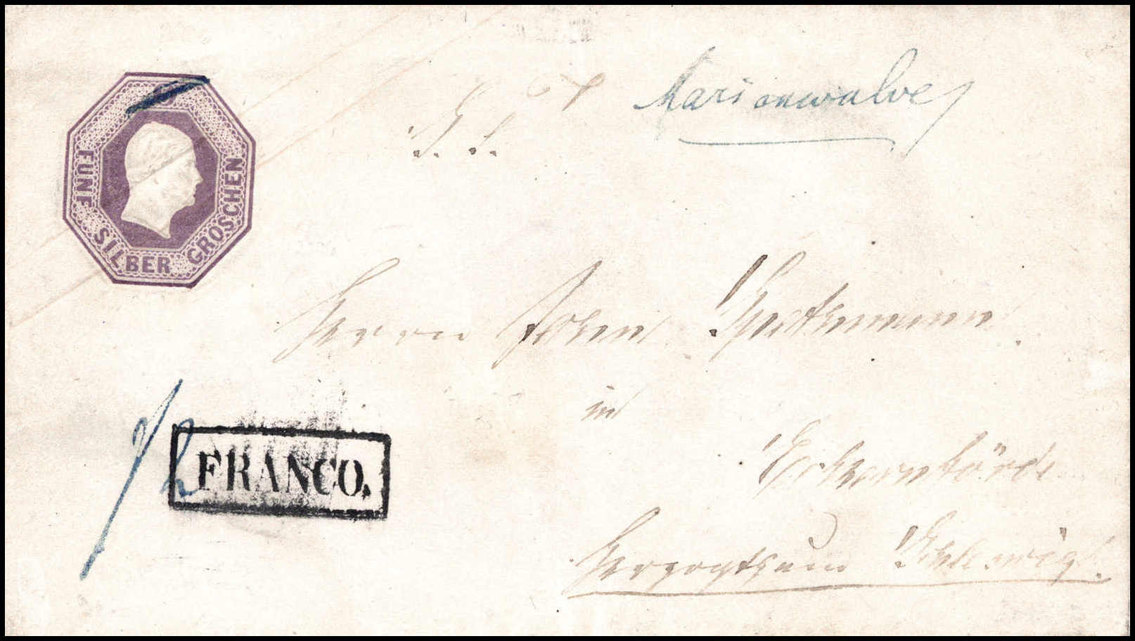 5 Sgr., Wertstempel Nr. 2, frischer Kabinett-Umschlag mit seltener hs. Entwertung "Marienwalde" nach Eckernförde/Herzogthum Schleswig. Weiterfranko-Vermerk "f2". Seltenes Dänemark-Porto
