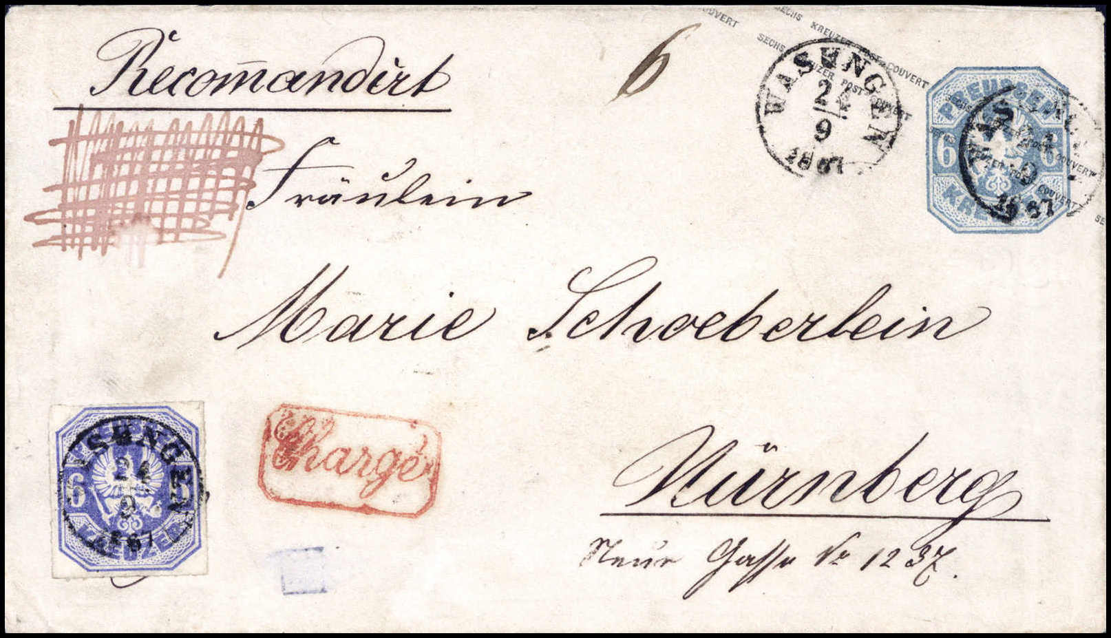 6 Kr., farb- und wertstufengl. Zusatzfrankatur auf rekommand. Ganzsachenumschlag 6 Kr. ultramarin mit klaren Taxis-K1 WALSUNGEN nach Nürnberg (etwas gereinigt), beiges. roter R1 "Chargé"
