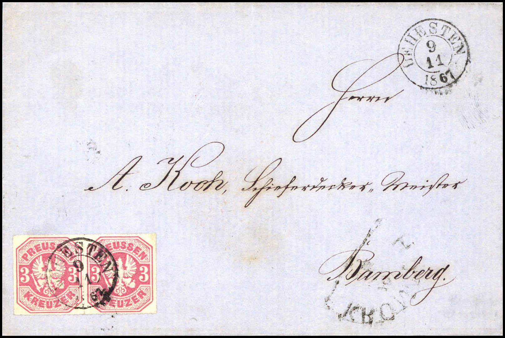 3 Kr., waagr. Luxuspaar mit klaren Taxis-K2 LEHESTEN auf Brief nach Bamberg