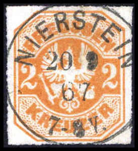 2 Kr., tieffarbiges, waagr. Kabinettpaar mit zwei zentr. aufges. K1 GIESSEN ST. P. E. 30/12 67 (vorletzter Verwendungstag) auf schönem, innen nicht ganz kpl. Faltbrief nach Nauheim, sign. Kruschel. Katalogpreis: 1.300,-
