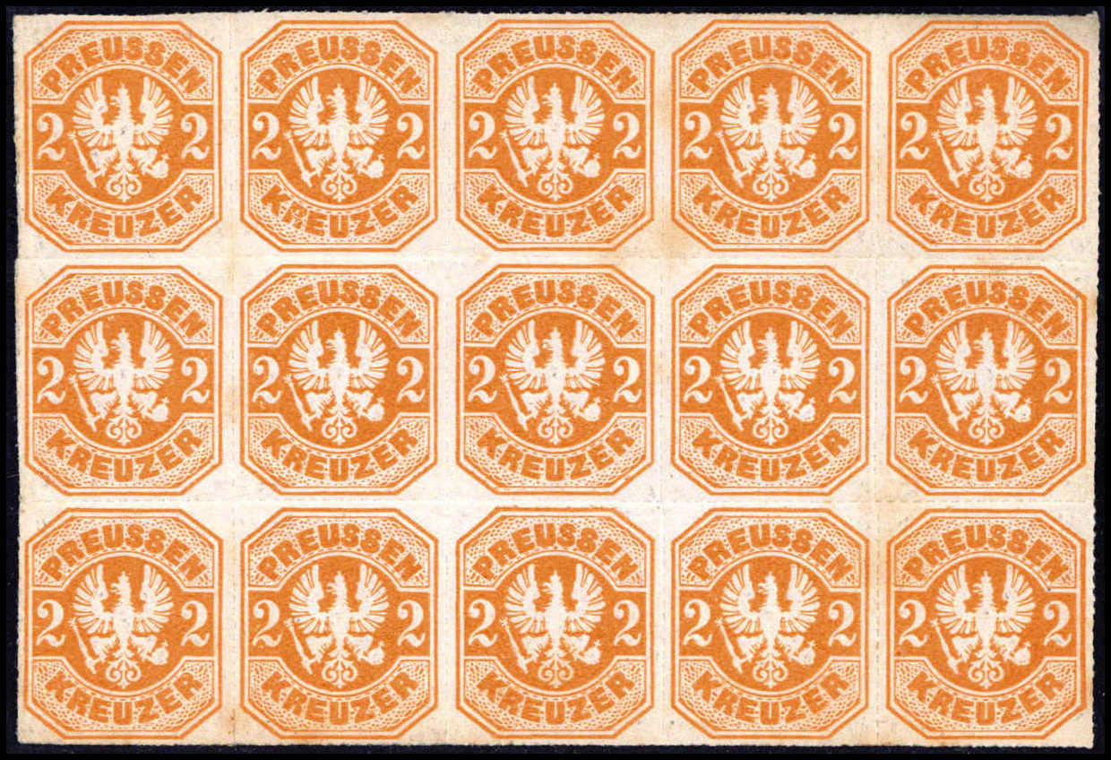 2 Kr., ungebr. waagr. 15er-Block, bildseitig perfekt, rs. einige Gummifleckchen (wenige Marken postfrisch). Eine seltene Einheit