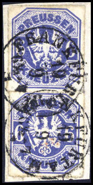 6 Kr. hellpreussischblau, leuchtende Farbe, senkr. Kabinettpaar auf Briefstück mit zentr. klarem Taxis-K1 FRANKFURT a.M., es sind nur ganz wenige Paare dieser Farbnuance bekannt geworden, Fotoattest Brettl. Katalogpreis: 1.100,-+