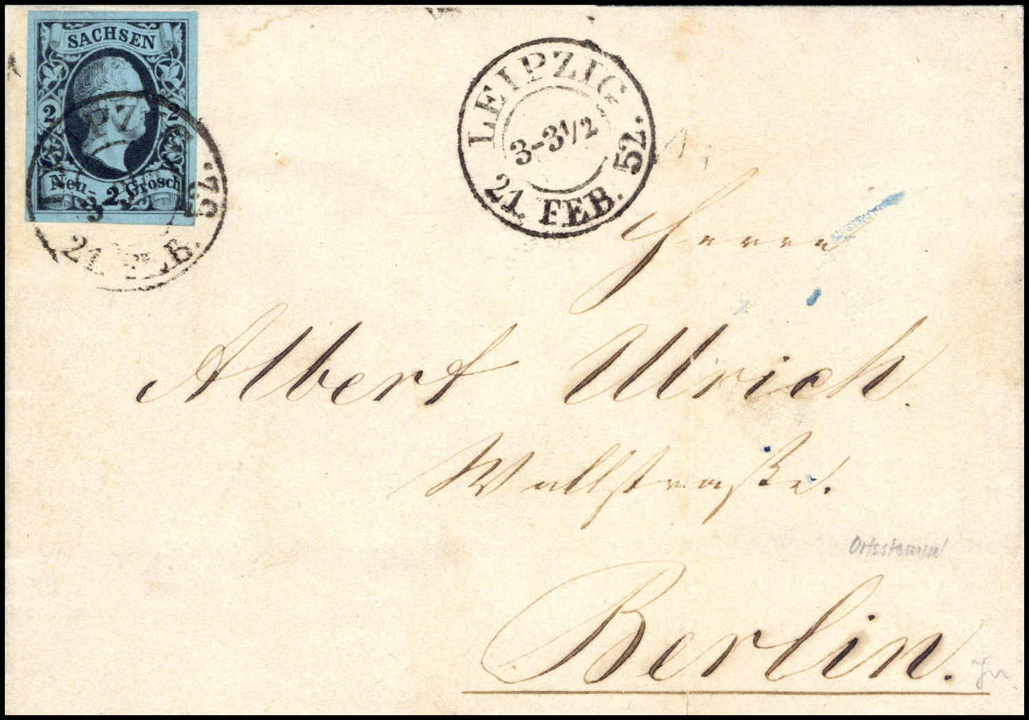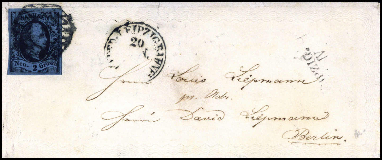 2 Ngr., breitrandiges Kabinettstück auf kleinem weißem Präge-Zierbrief von Leipzig-Bahnhof nach Berlin. Als Zierbrief der Ausgabe Friedrich-August sehr selten