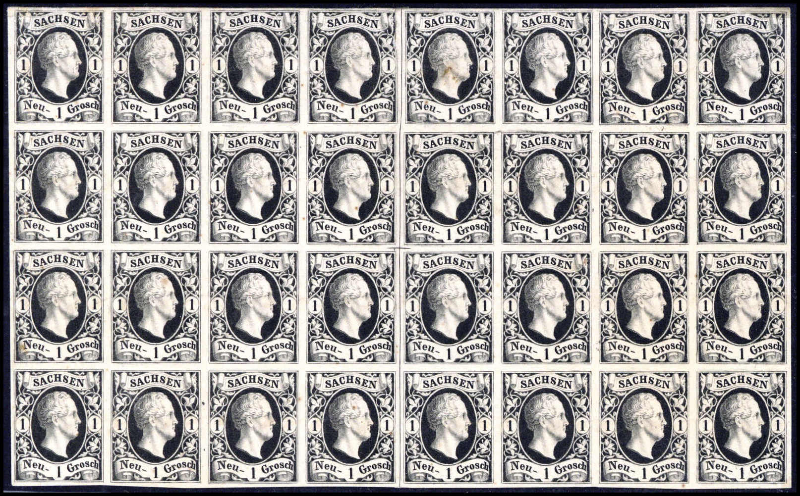 1 Ngr. a. weiß, waagr. 32er-Block aus dem Revisions-Druckbogen auf weißem Kartonpapier, ringsum breitrandig (einige wenige Werte kl. Beanstandung). Eine ebenso dekorative wie seltene Einheit, Fotoattest Vaatz BPP