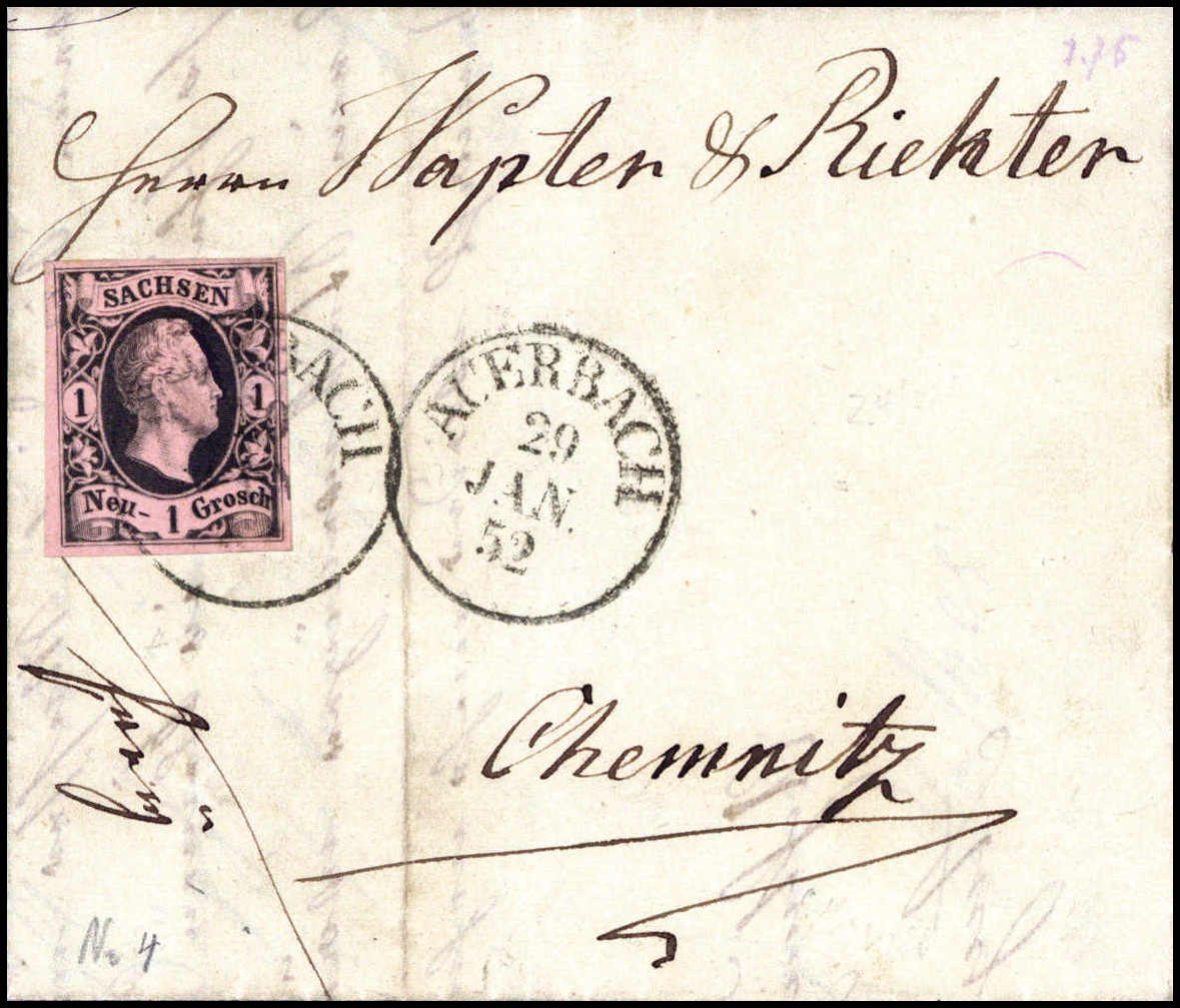 1 Ngr., Kabinettbrief mit seltener Ortsstempel-Entwertung durch K1 AUERBACH 29/1 52