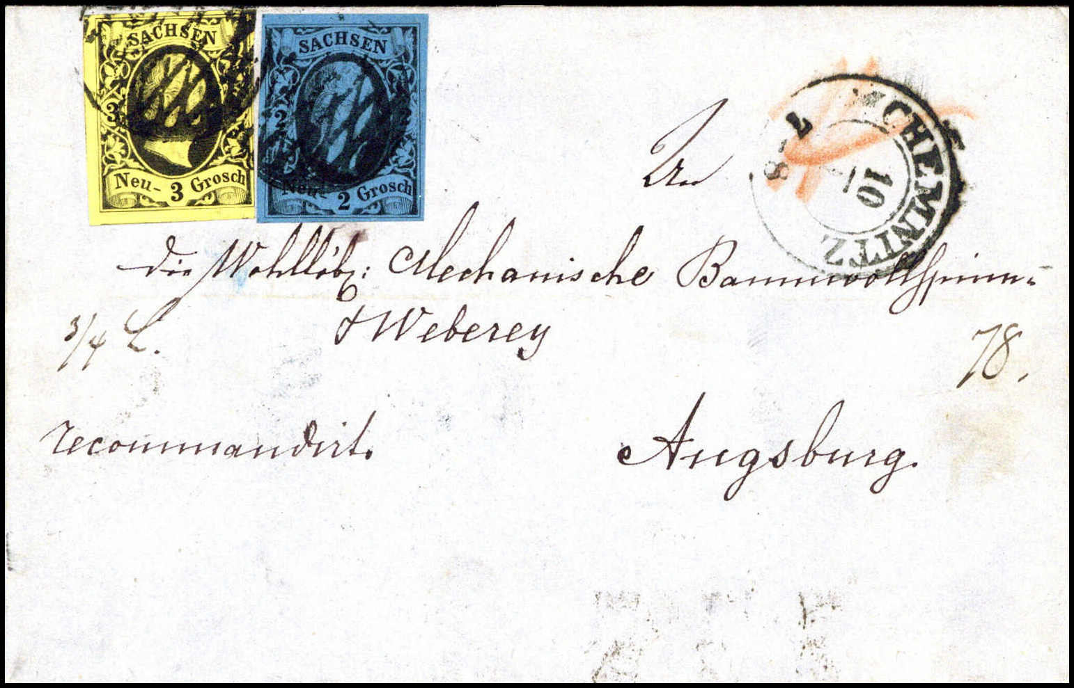 3 Ngr., bis auf kl. Stelle breitrandig mit 2 Ngr. a. dunkelblau auf schönem, rekommandiertem Brief nach Augsburg, zentr.VG und K2 CHEMNITZ