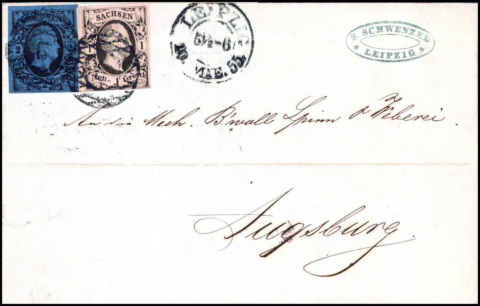 1 Ngr. mit 2 Ngr. a. dunkelblau, Kabinettstücke auf frischem Faltbrief von Leipzig nach Augsburg