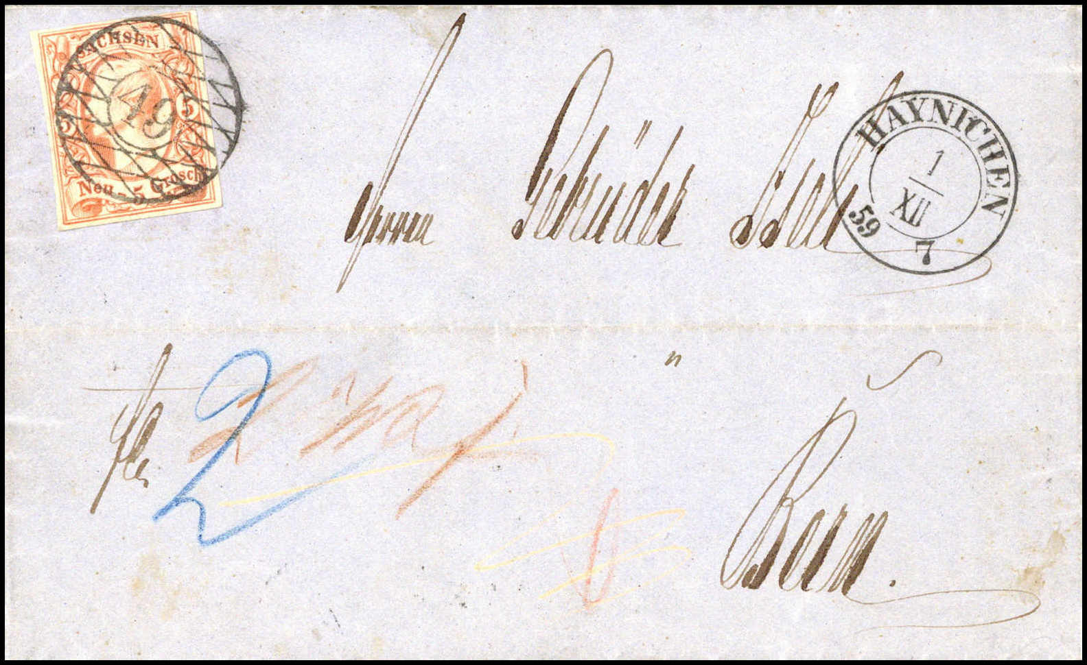5 Ngr., Luxusstück mit idealem Stempel "49" HAYNICHEN auf blauem Faltbrief in die Schweiz