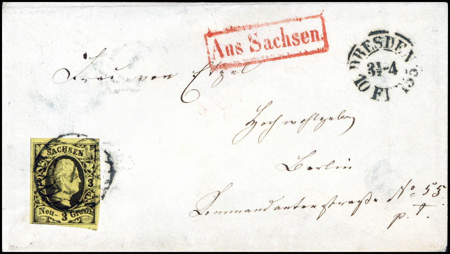 2 Ngr., kleiner Kabinettbrief mit zentr. Stempel "1" DRESDEN nach Berlin, beiges. roter R1 "Aus Sachsen"