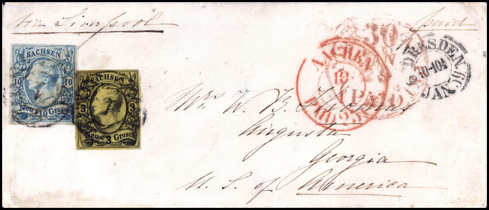 10 Ngr. milchblau zusammen mit 3 Ngr. a. gelb, frische Kabinettstücke mit zentr. Stempel "1" DRESDEN auf schönem Transatlantik-Brief (1859) via Aachen/Liverpool in die USA. In dieser schönen Qualität selten, Fotoattest Rismondo BPP