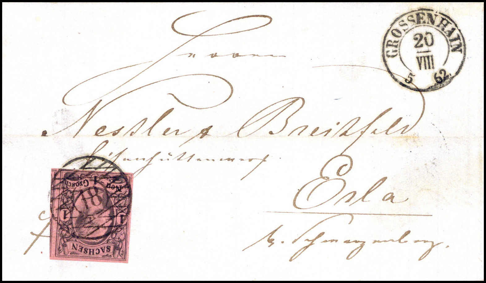 1 Ngr., breitrandiges Kabinettstück mit klarem Stempel "18" GROSSENHAIN auf Brief nach Erla. Katalogpreis: 280,-