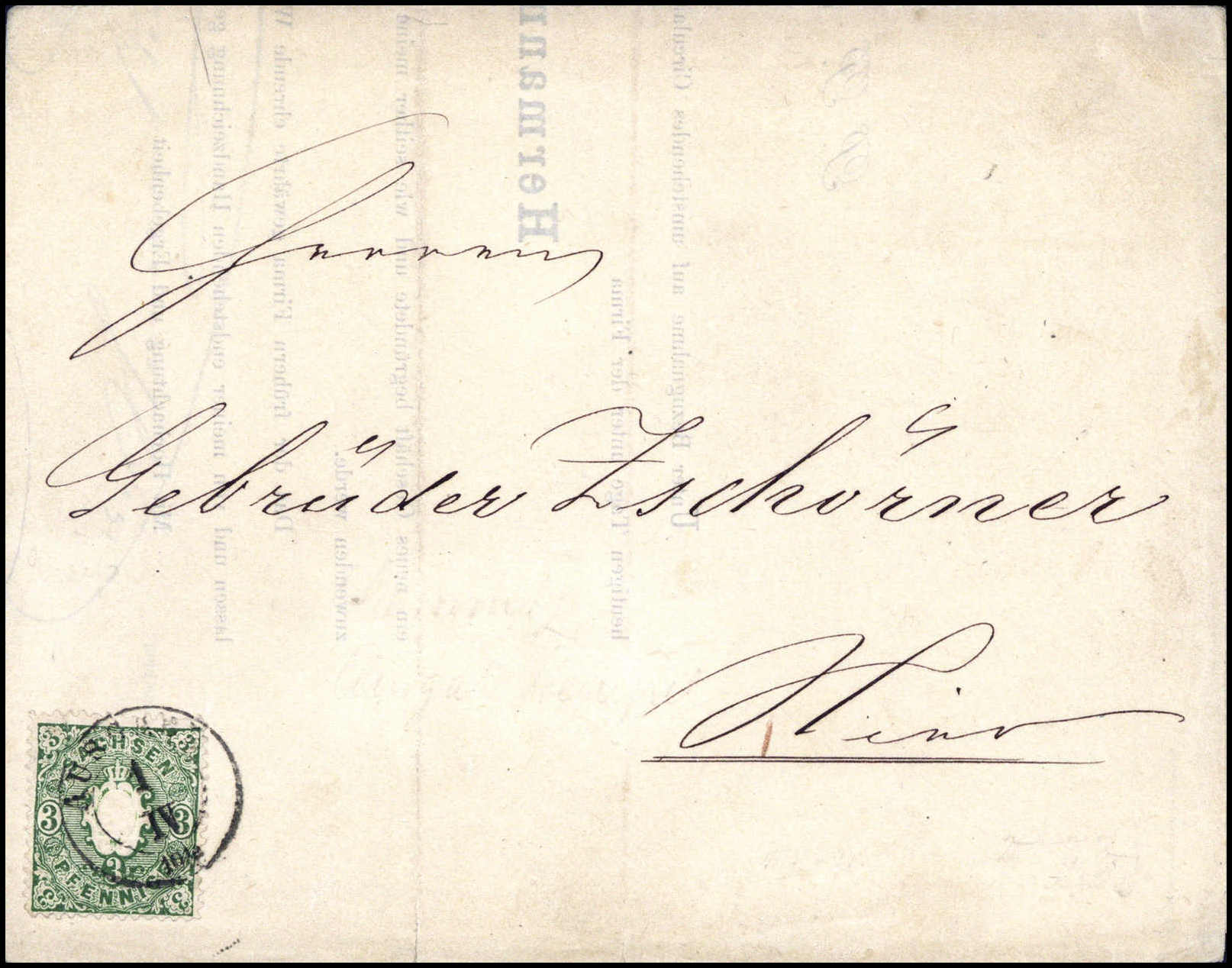 3 Pfg., Einzelfrankatur auf weißer Orts-Drucksache aus Chemnitz. Sehr seltene Entwertung durch K2 AUSGABE 1/IV