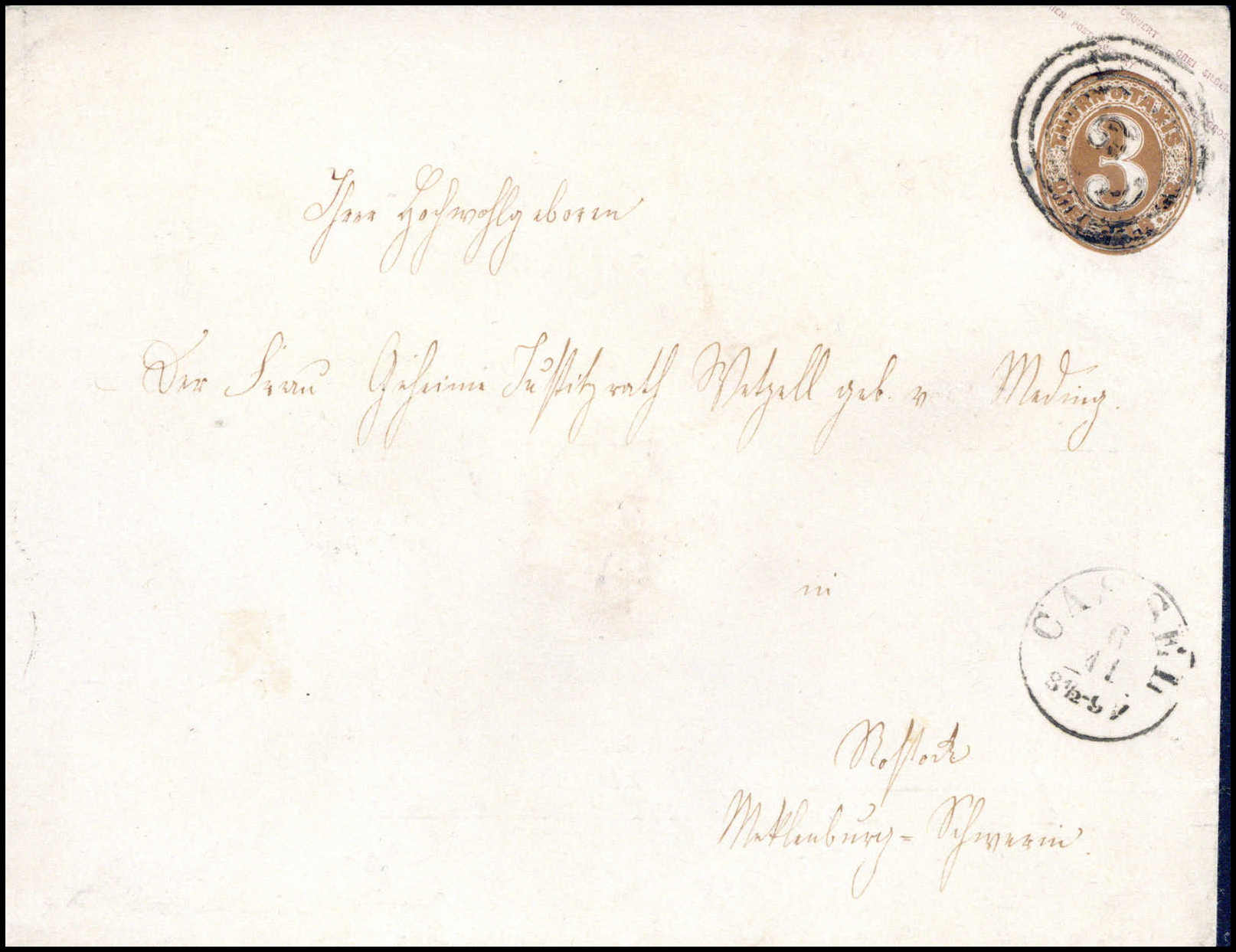 3 Sgr., Kabinett-Umschlag mit Stempel "14" und beiges. K1 CASSEL nach Rostock. In dieser Qualität selten. Katalogpreis: 650,-