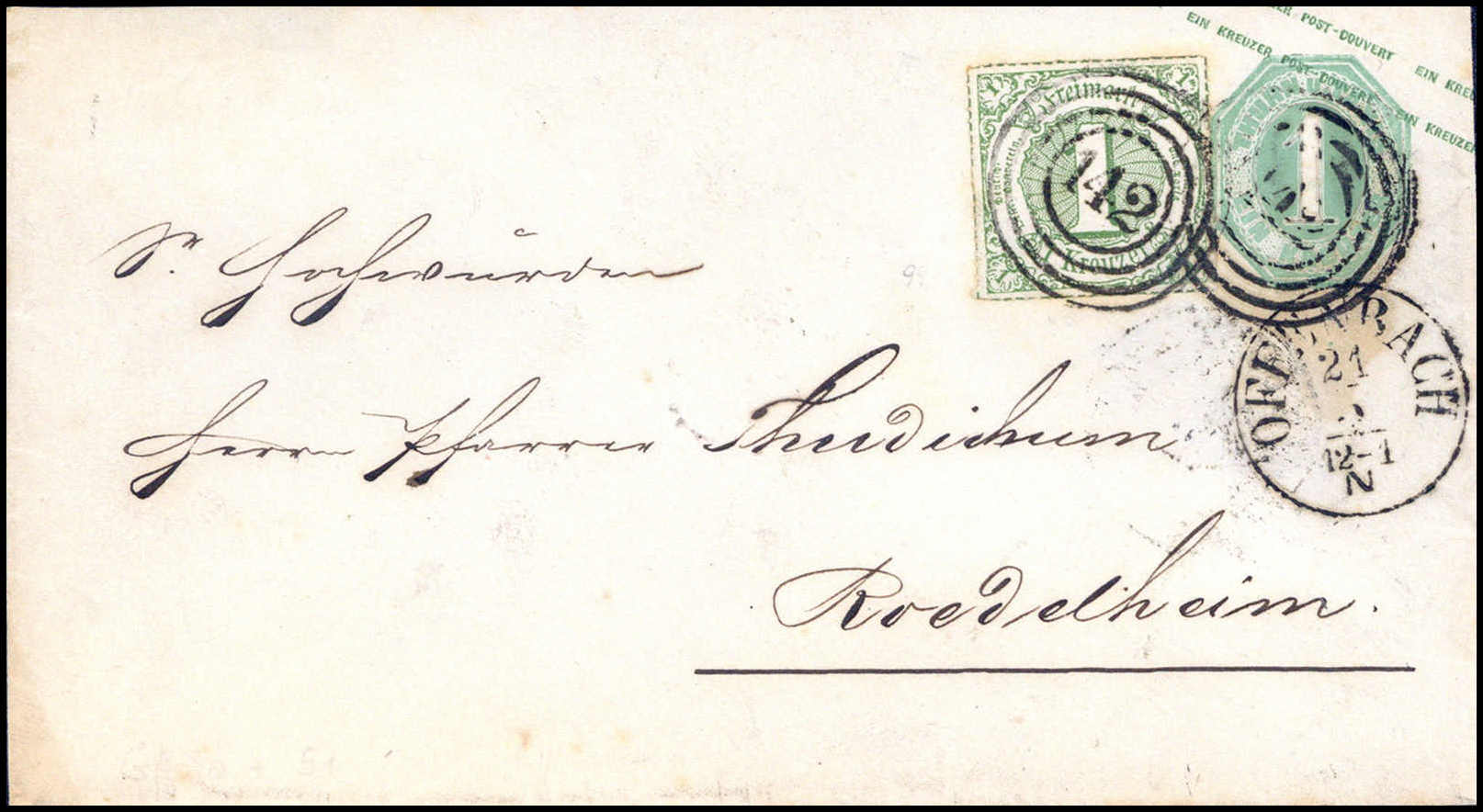 1 Kr., Zusatzfrankatur auf Ganzsachenumschlag 1 Kr. bläulichgrün mit Stempel "142" OFFENBACH nach Roedelheim