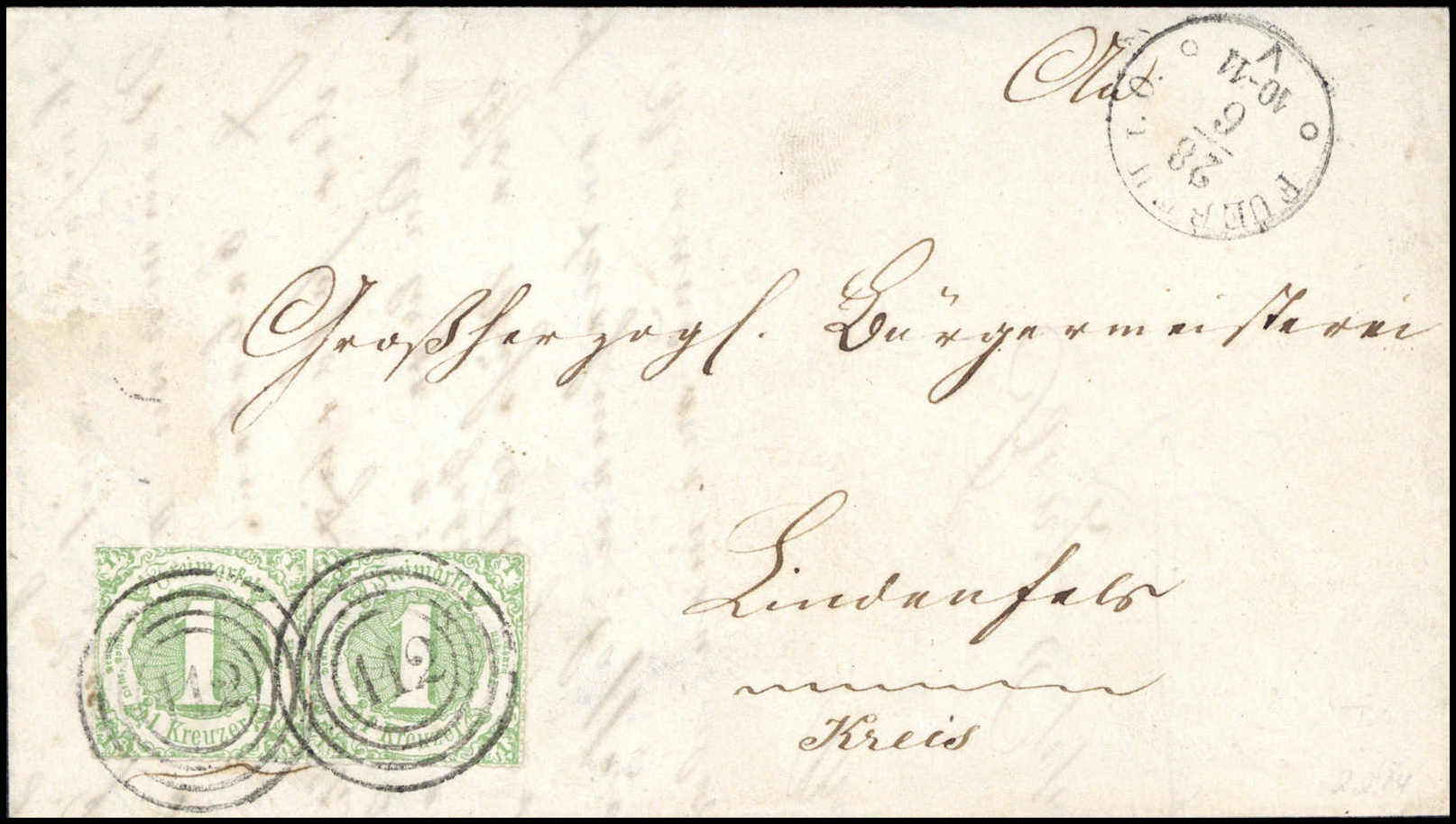 1 Kr., waagr. Luxuspaar mit idealen Stempeln "112" FUERTH i.O. auf Brief nach LIndenfels