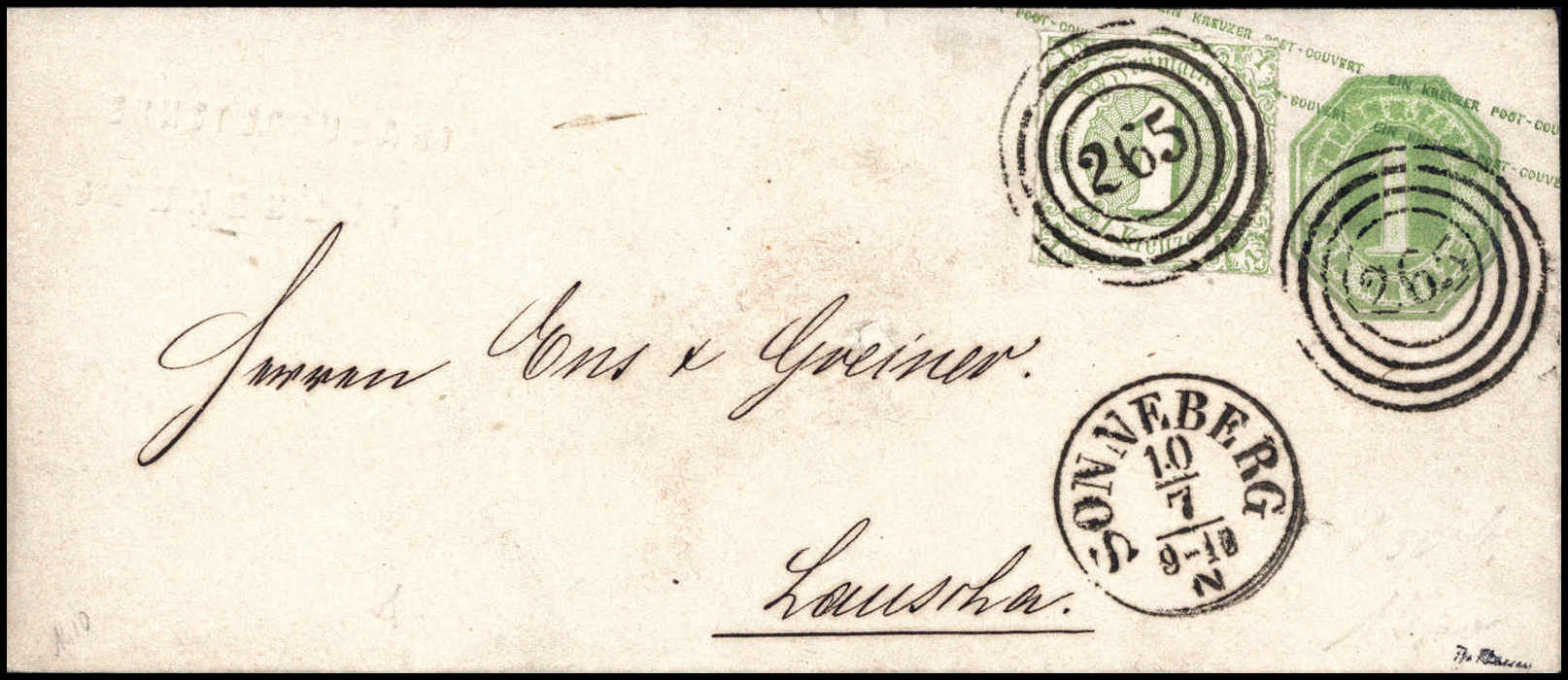 1 Kr., Zusatzfrankatur auf Ganzsachenumschlag 1 Kr. grün (kl. Format) mit klaren Stempeln "265" SONNEBERG nach Lauscha. Eine seltene Kombination in frischer u. sauberer Erhaltung