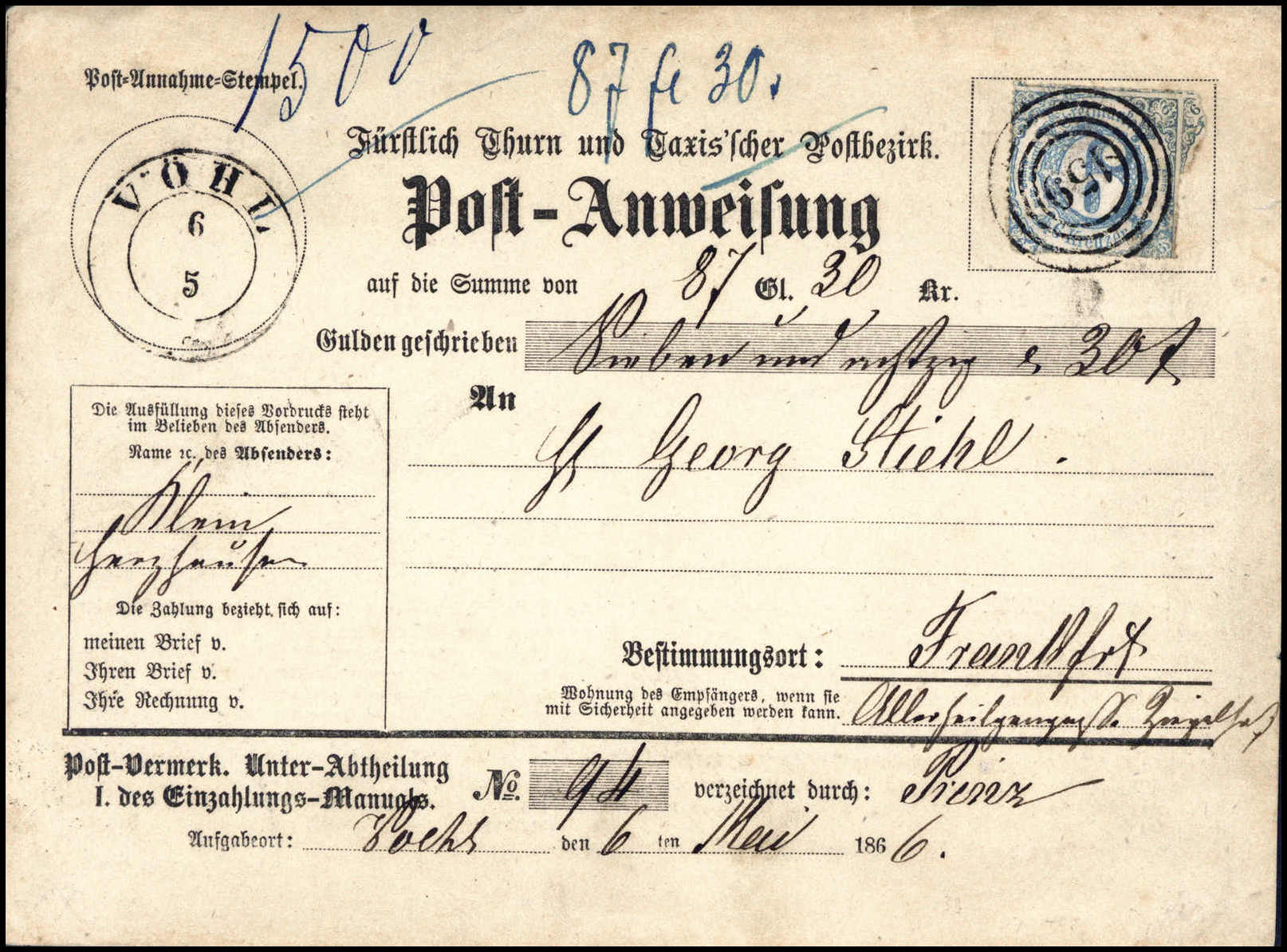 6 Kr., Einzelfrankatur auf Postanweisung über 87,30 Gulden mit zentr. Stempel "159" VÖHL (Marke winz. unregelm. Durchstich)
