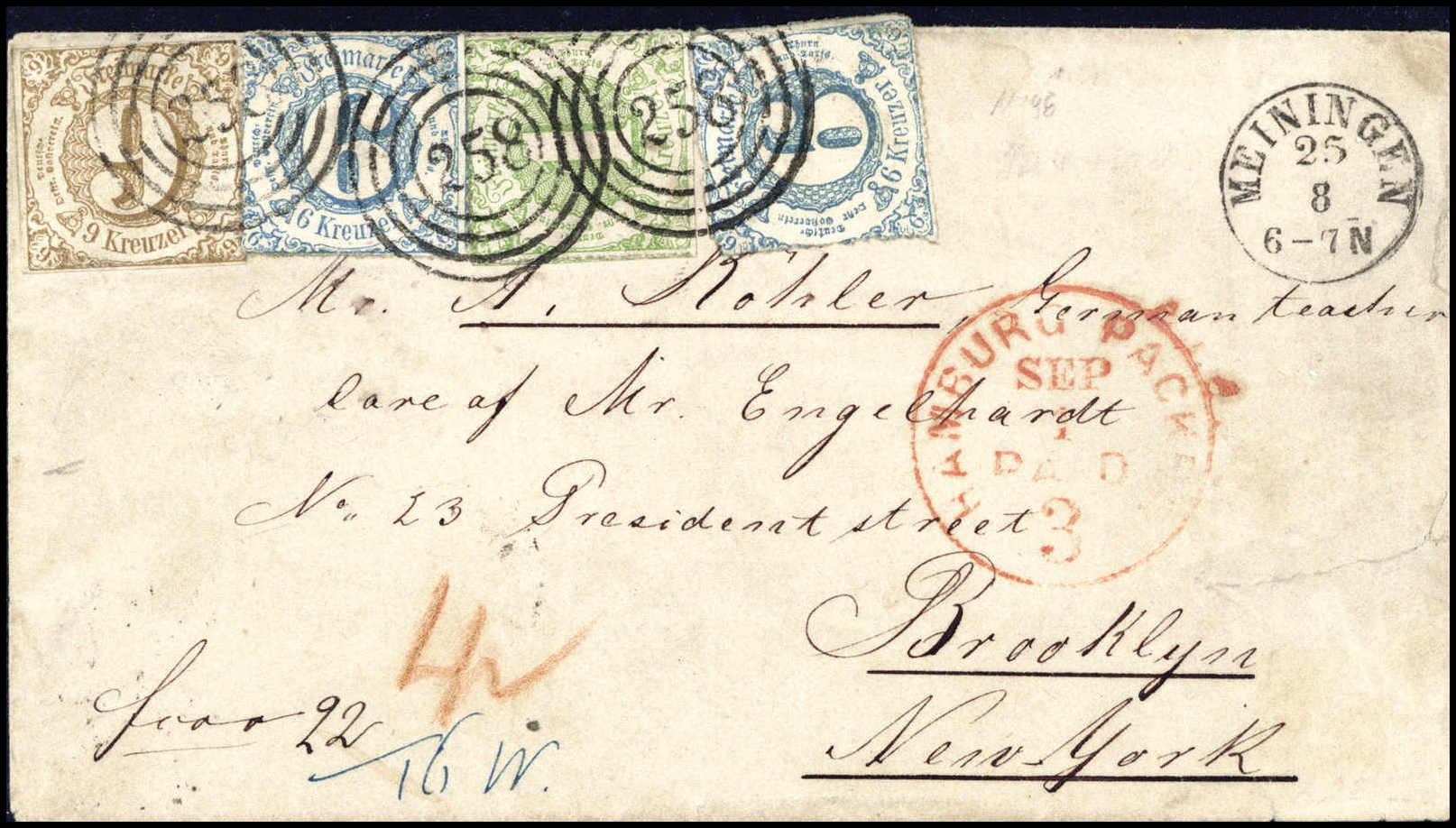 1 Kr. mit zweimal 6 Kr. blau und 9 Kr. ockerbraun als außergewöhnliche 22 Kr.-Kombination auf Brief in die USA, klare Stempel "258" MEININGEN, befördert über Hamburg mit rotem K1 HAMBURG PACKET. Trotz kl. Mängel ein attraktiver u.
